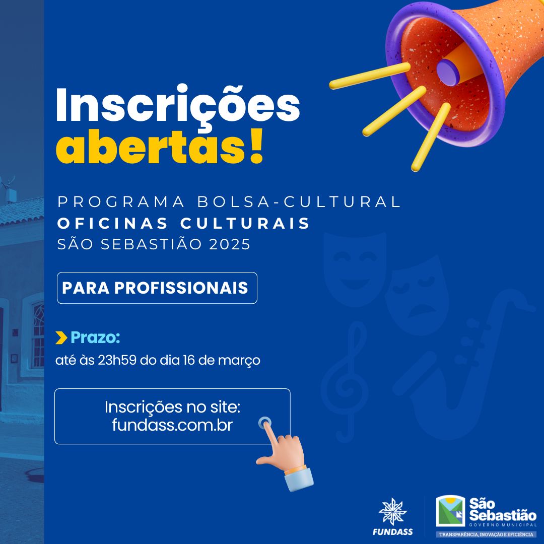 A Prefeitura de São Sebastião, por meio da Fundação Educacional e Cultural ‘Deodato Sant’Anna’ (Fundass), está com inscrições abertas, até às 23h59 do dia 16 de março, para a seleção de profissionais de arte e cultura interessados em receber a Bolsa-Cultural, tendo como contrapartida o desenvolvimento de atividades culturais voltadas à comunidade sebastianense no ano de 2025.