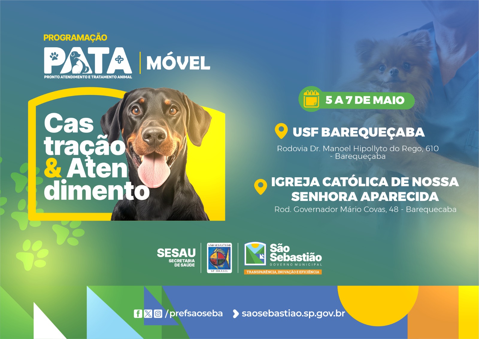 A Prefeitura de São Sebastião, por meio da Secretaria de Saúde (Sesau), realiza atendimento com a unidade do PATA móvel, que até a próxima quarta-feira (7/5), estará em Barequeçaba, atendendo aos animais do bairro. A equipe realizou o primeiro dia de atendimento nesta segunda-feira (5/5) para realizar as castrações de cães e gatos, na Rodovia Dr. Manoel Hyppolito do Rego (SP-55), próximo à igreja e à Unidade de Saúde da Família (USF).