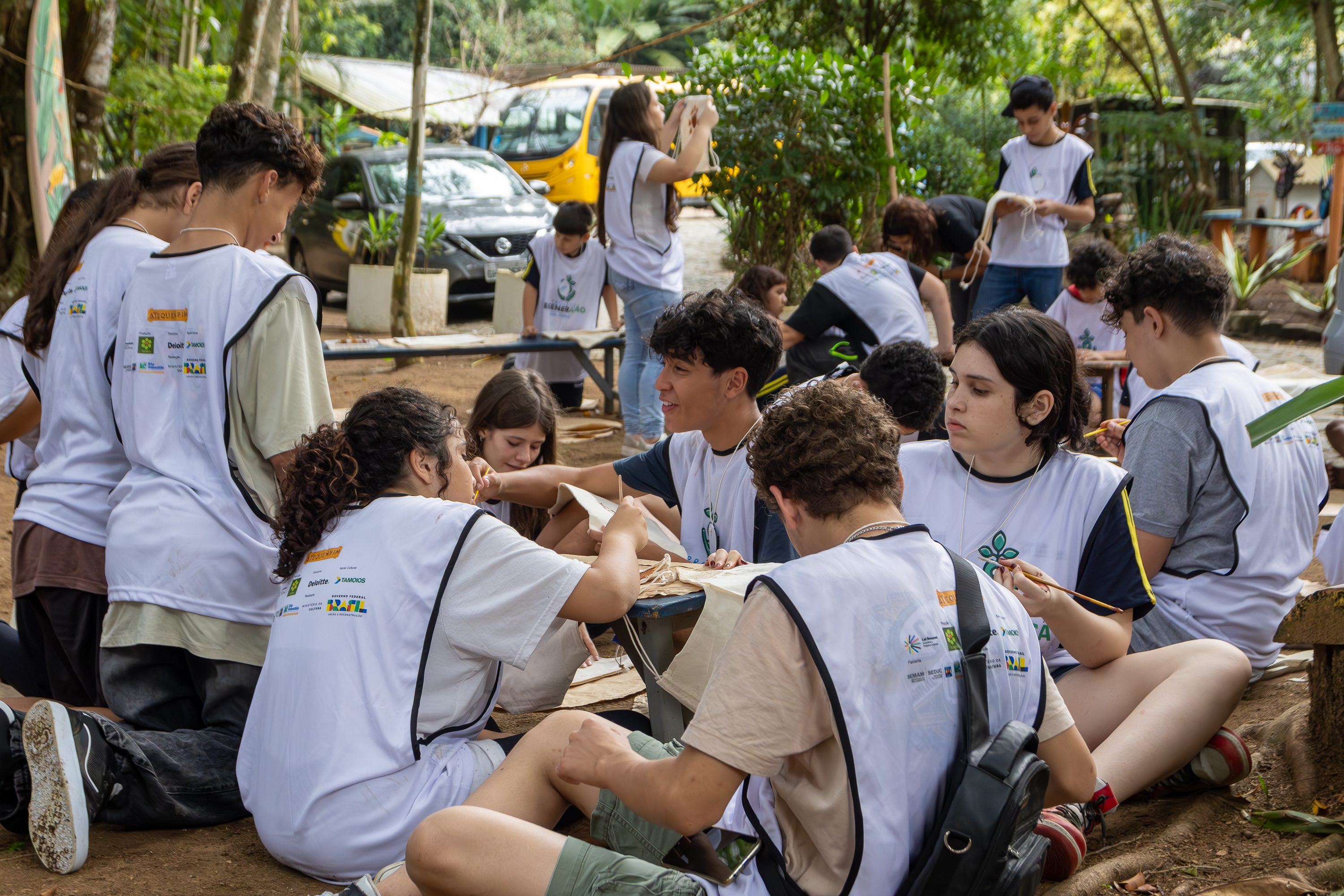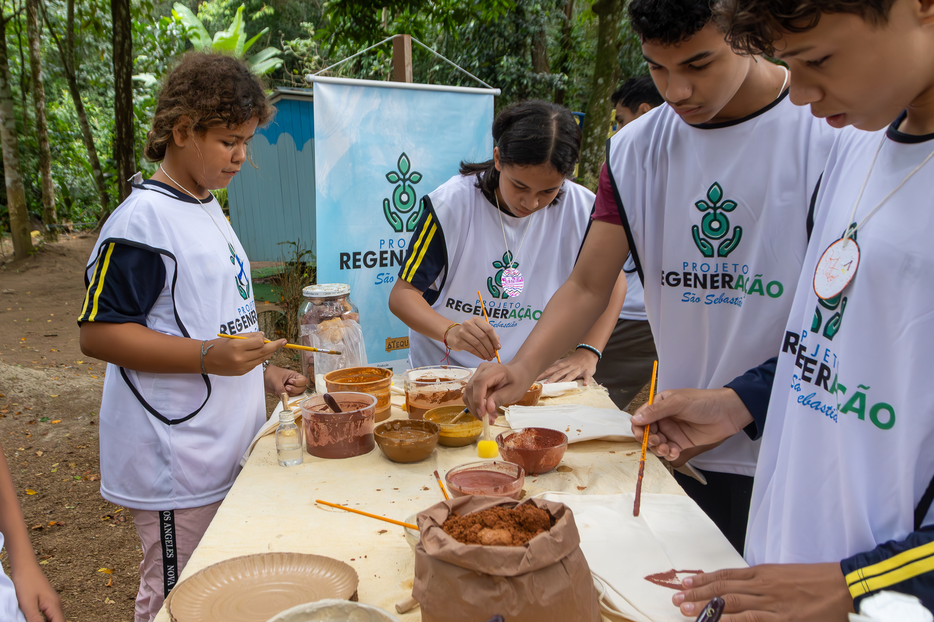 Em seguida, participaram de uma oficina criativa onde pintaram ecobags utilizando tintas naturais feitas a partir da própria terra, reforçando conceitos de sustentabilidade, reaproveitamento de recursos e conexão com o meio ambiente.