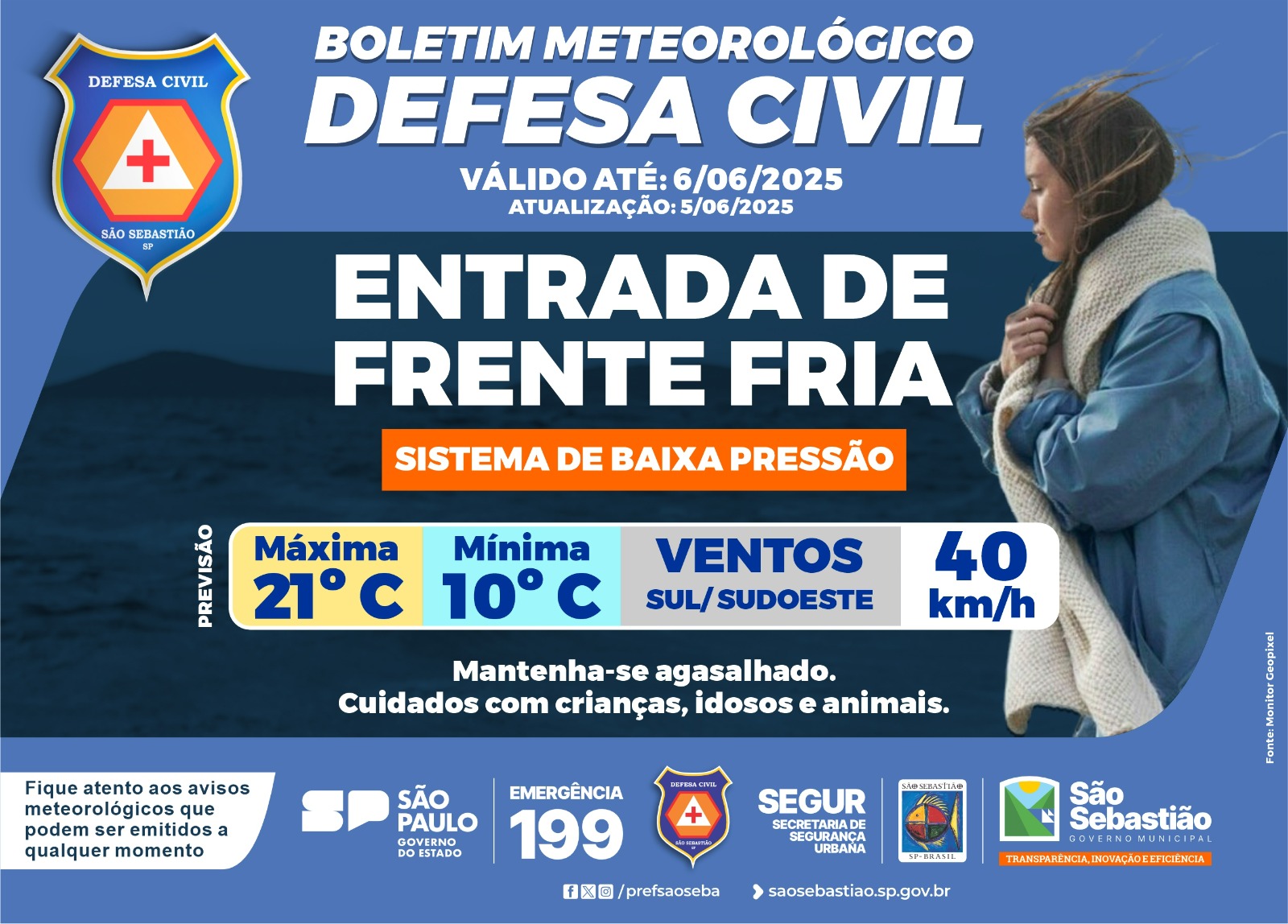 A previsão é do Instituto Nacional de Meteorologia (INMet) para esta quinta-feira (5/6) e deve permanecer até a manhã de sexta-feira (6/6). Conforme a Defesa Civil de São Sebastião, a temperatura máxima deve chegar a 21ºC e a mínima 10ºC.