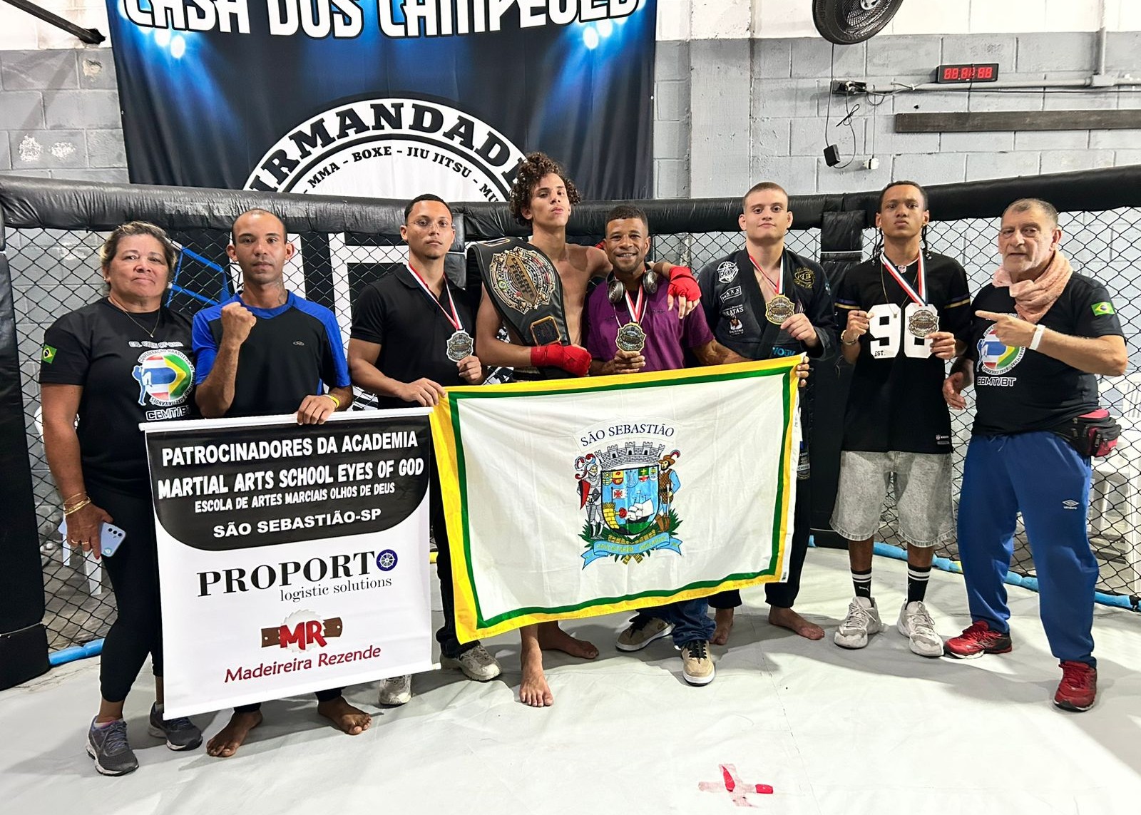 #PraTodosVerem: o atleta de São Sebastião, Kauan Cristian Gomes Ferreira, de 16 anos, é destaque nas imagens ao conquistar o título de campeão paulista de Muay Thai na categoria Sub-17. Em clima de celebração, ele aparece no pódio com a medalha de ouro no peito, ao lado de outros competidores, e exibe com orgulho a bandeira de São Sebastião ao lado de apoiadores e representantes locais. Fim da descrição.