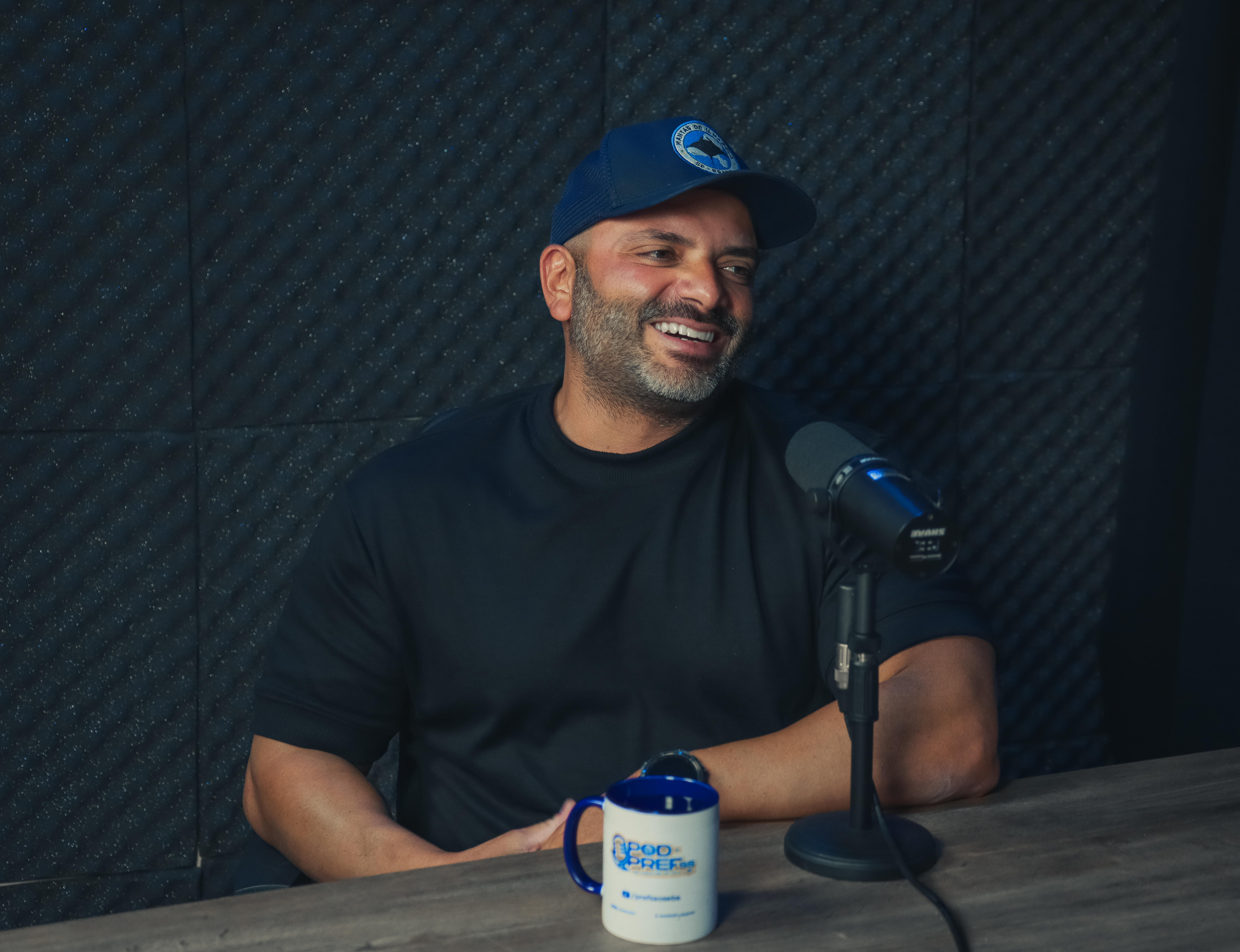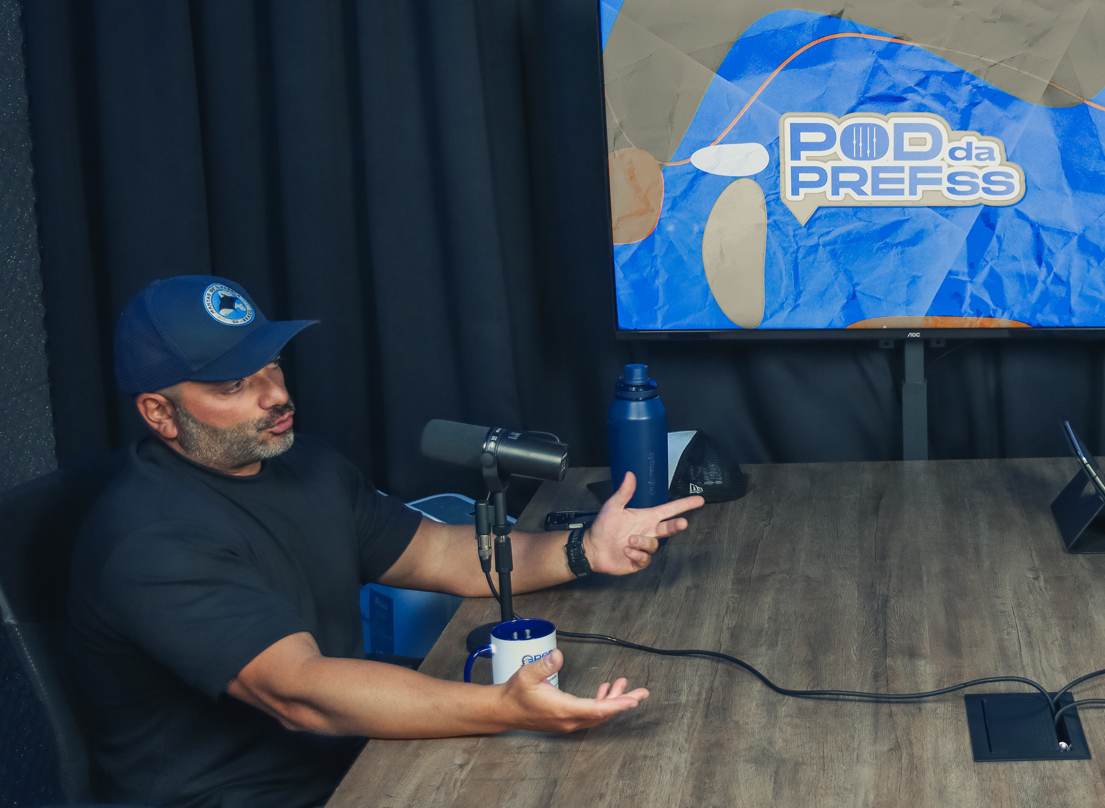 #PraTodosVerem: As imagens registram o clima descontraído da gravação do Pod da Prefs, com os participantes reunidos em estúdio, sorridentes e à vontade durante a conversa. Sentados à mesa, eles compartilham o momento com canecas personalizadas do programa, enquanto o cenário exibe o logotipo no monitor ao fundo. Fim da descrição.