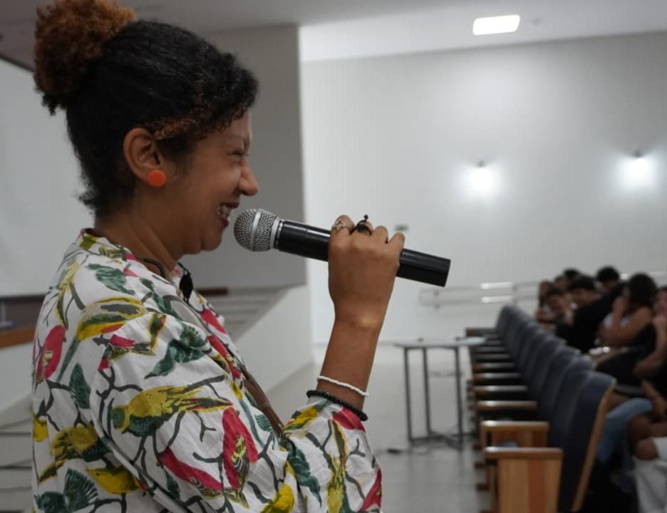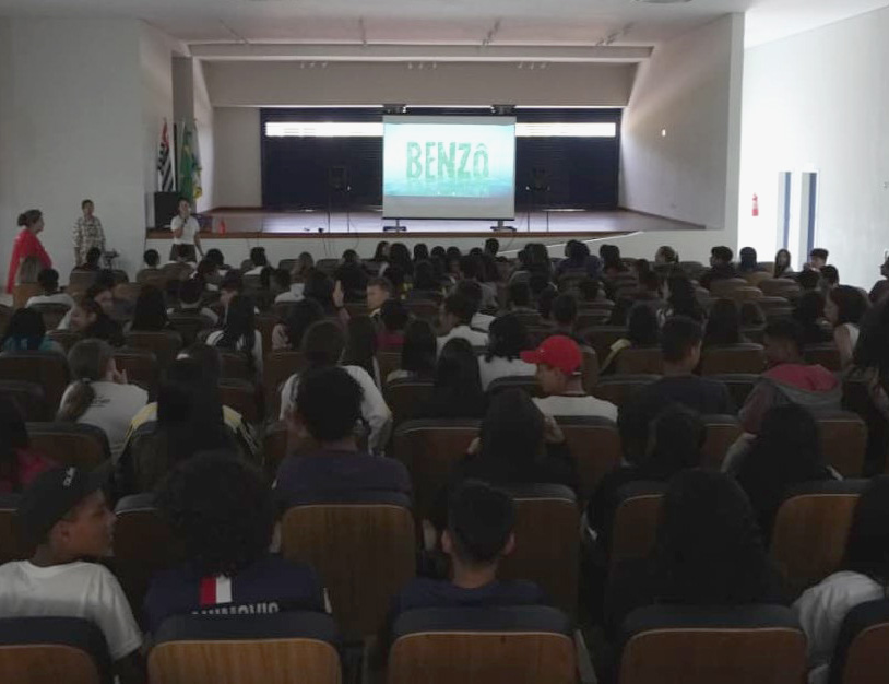 #PraTodosVerem: Estudantes lotam o auditório para assistir à exibição do filme ‘Benzo’, seguida por uma conversa animada com os integrantes da equipe do longa. Durante o encontro, a diretora dialoga com o público, compartilhando bastidores da produção e reflexões sobre o tema abordado, enquanto o clima descontraído de troca e aprendizado marca o evento cultural e educativo. Fim da descrição.