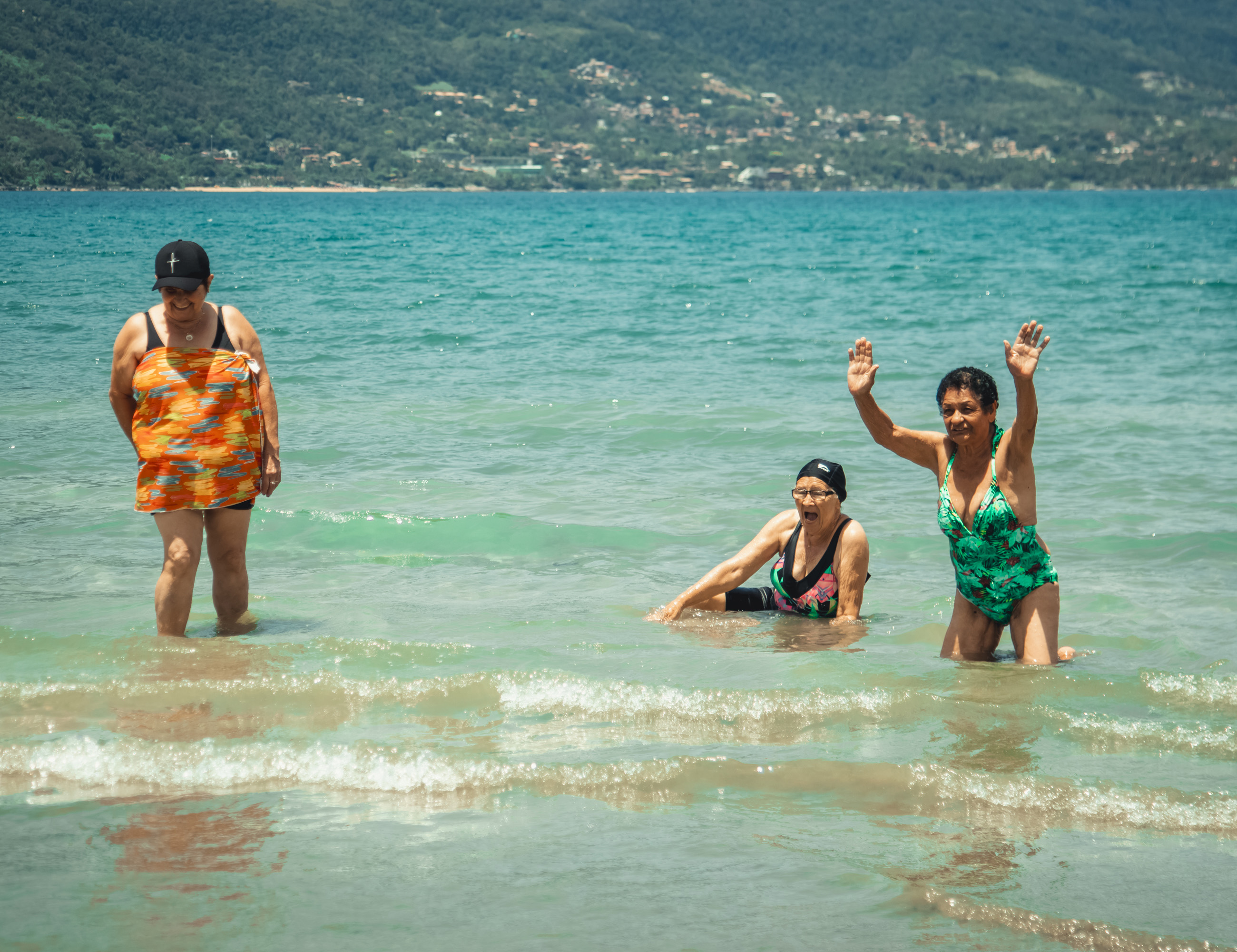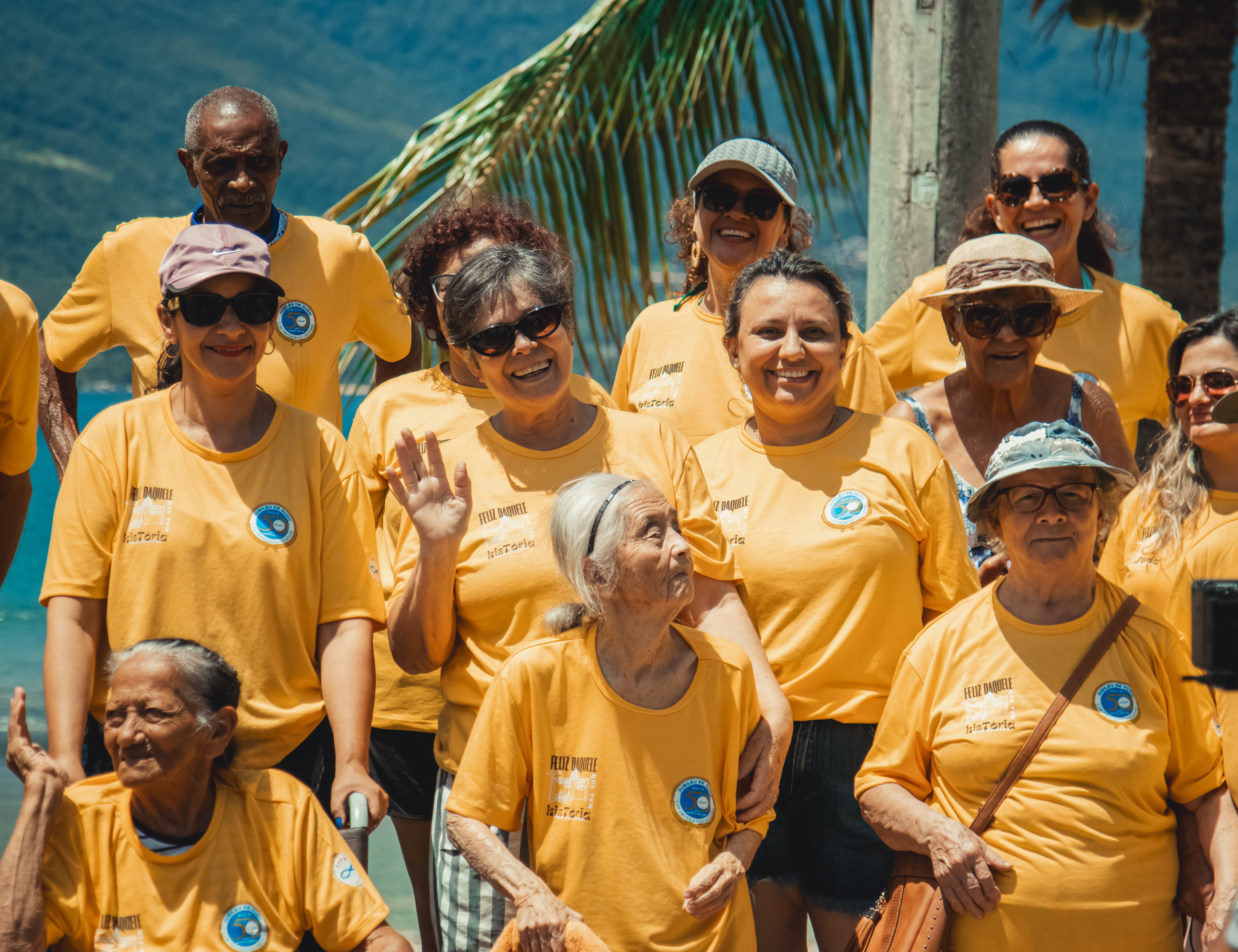#PraTodosVerem: imagem de um grupo de pessoas idosas entre mulheres e homens do Projeto Conviver, reunidos durante a chegada no Balneário dos Trabalhadores, para a vivência ‘Turismo de um Dia’, outra imagem de duas mulheres, desfrutando do momento de lazer, um mergulho no mar, mais uma imagem de três mulheres da terceira idade reunidas aproveitando a praia durante a vivência e a última imagem de um grupo de idosos, homens e mulheres do Lar Vicentino reunidos na praia para a vivência. Fim da descrição.