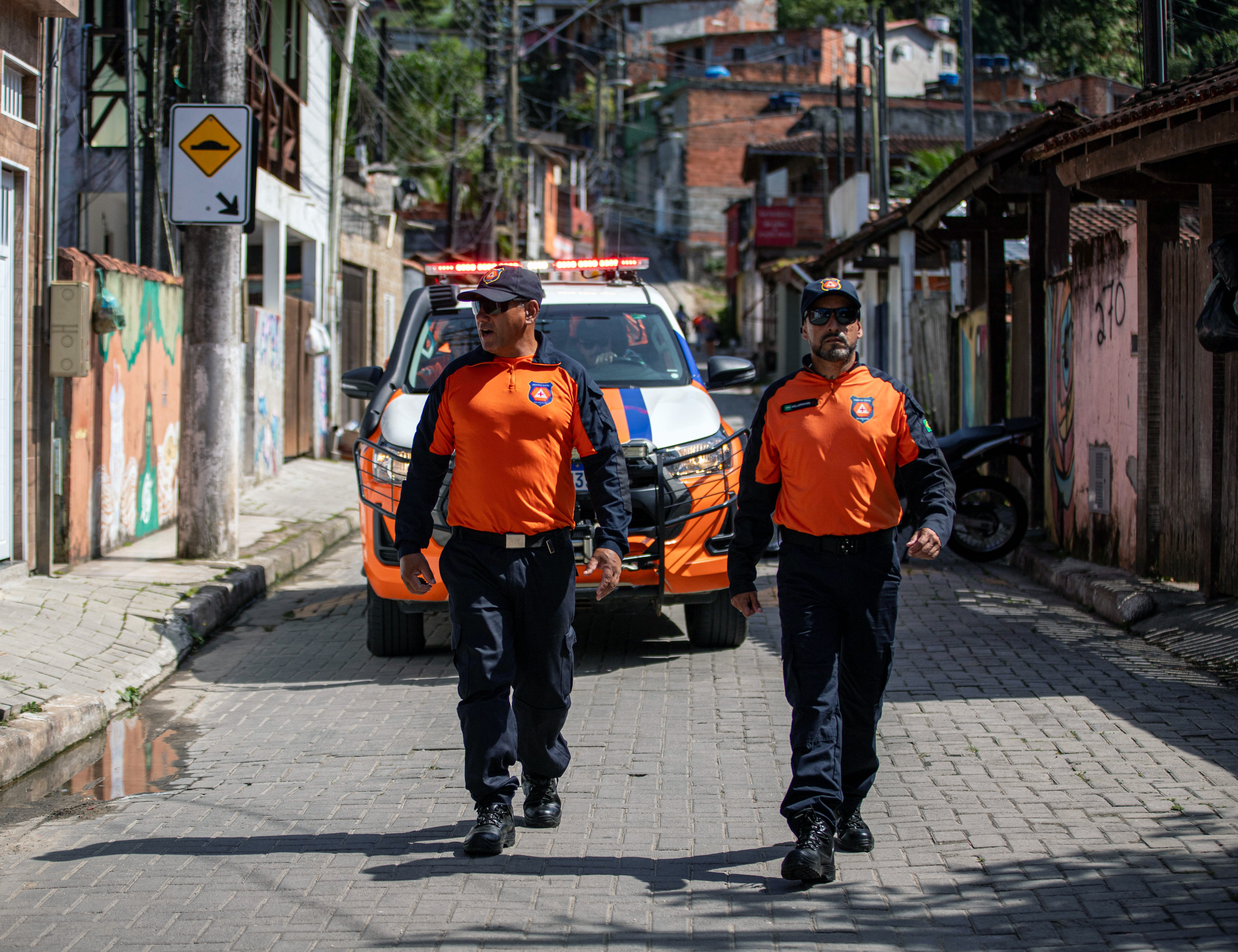 #PraTodosVerem: Imagens mostram agentes da Defesa Civil com uma viatura logo atrás; em outro quadro, estudantes ouvem o que agentes falam e na outra imagem há casarios da Vila Sahy. Fim da descrição.