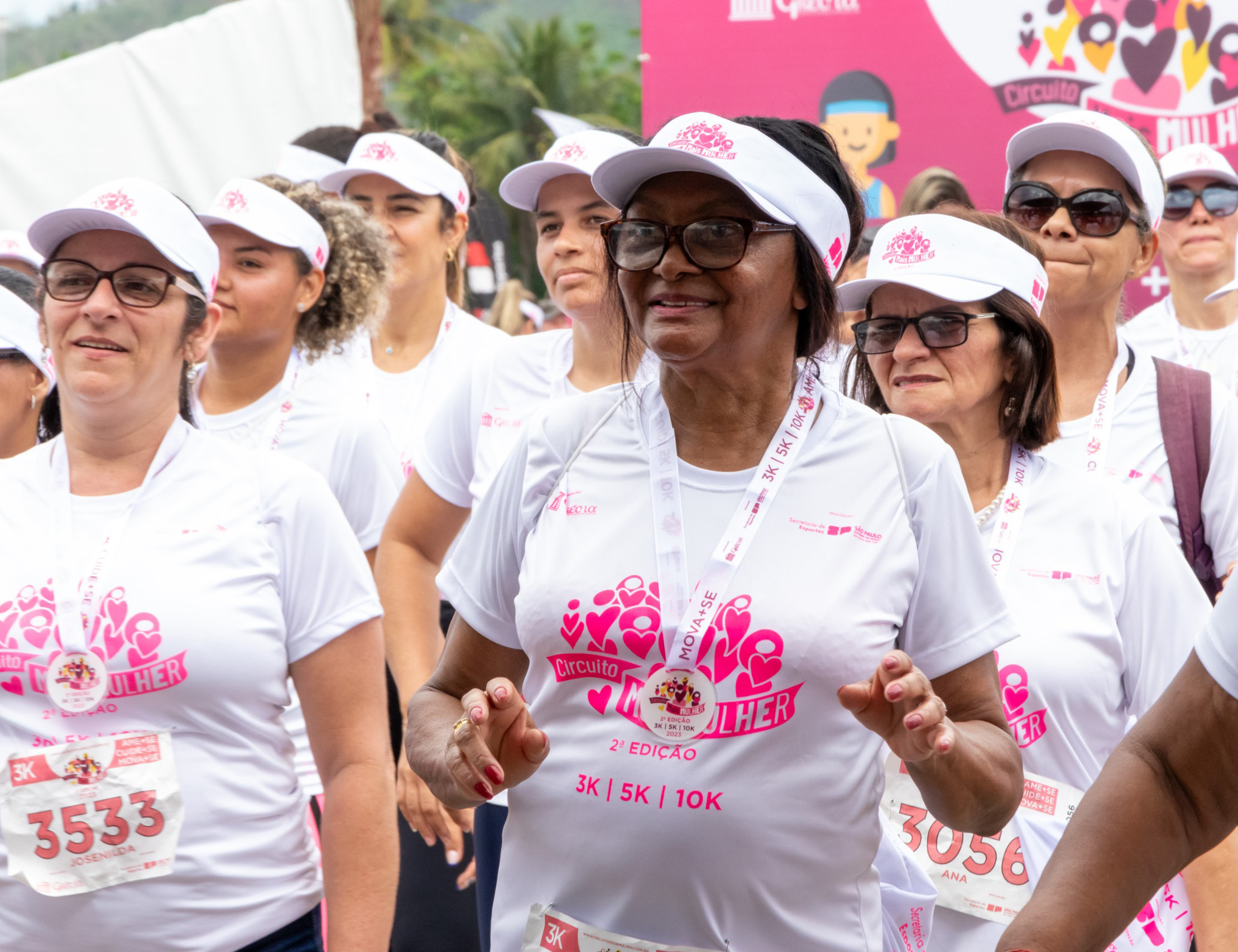 #PraTodosVerem: Centenas de mulheres participam do Circuito Mais Mulher ao ar livre cercada por coqueiros e montanhas, levantando os braços com entusiasmo na largada. Em outro momento, participantes recebem atendimento de massoterapeutas em uma tenda de recuperação, reforçando o clima de bem-estar e cuidado. As imagens também mostram corredoras cruzando a linha de chegada com alegria e superação, celebrando o esforço e a energia positiva do evento, que une esporte, saúde e empoderamento feminino. Fim da descrição.
