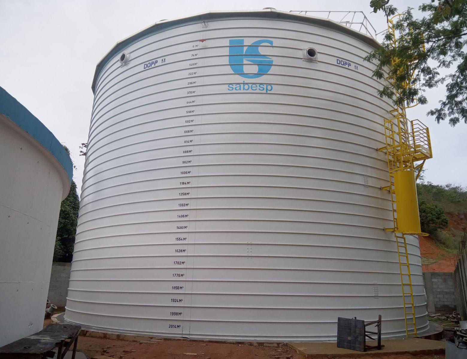 #Pratodosverem: Reservatório cilíndrico de grande porte da Sabesp, pintado na cor branca, ocupa o centro da imagem. Na parte superior está o logotipo da empresa em azul. Ao longo da lateral do reservatório há marcações de volume em metros cúbicos, indicando os níveis de armazenamento de água. À direita, uma escada metálica amarela sobe até o topo da estrutura. O céu está nublado e há árvores e um barranco ao fundo. Fim da descrição.