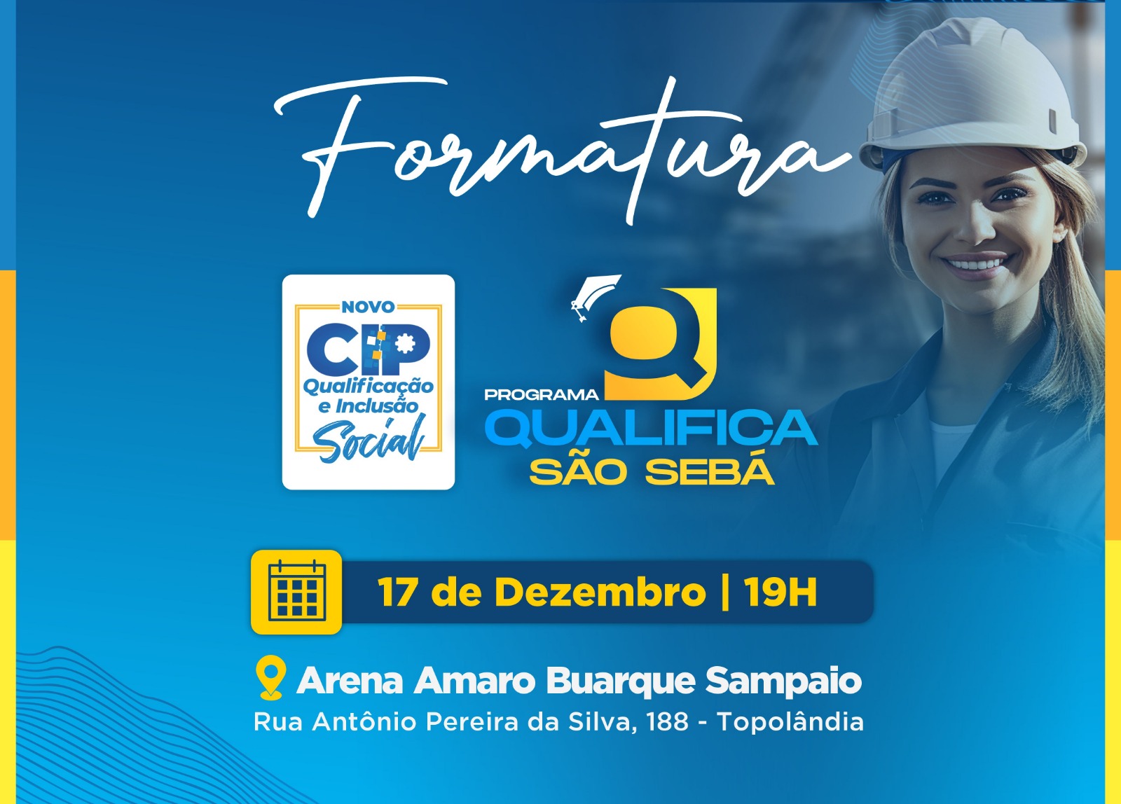 O programa municipal ‘Qualifica São Sebá’ realiza no dia 17, a partir das 19h, na arena esportiva ‘Amaro Buarque Sampaio’ (Ginásio Topolândia), a cerimônia de formatura de 2.800 alunos do programa municipal ‘Qualifica São Sebá’ 2024.