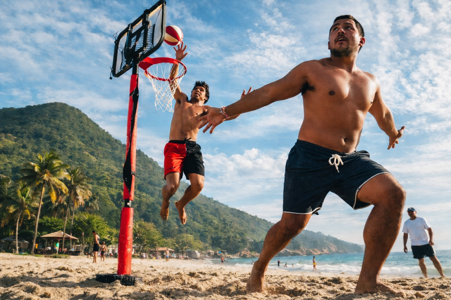 #PraTodosVerem: As imagens capturam a energia de uma partida de basquete de areia em um cenário tropical, onde homens sem camisa jogam sob um céu azul ensolarado. As cenas registram diferentes momentos da ação atlética ao redor de uma tabela com poste vermelho, desde um salto impressionante para uma enterrada enquanto um oponente defende. Fim da descrição.