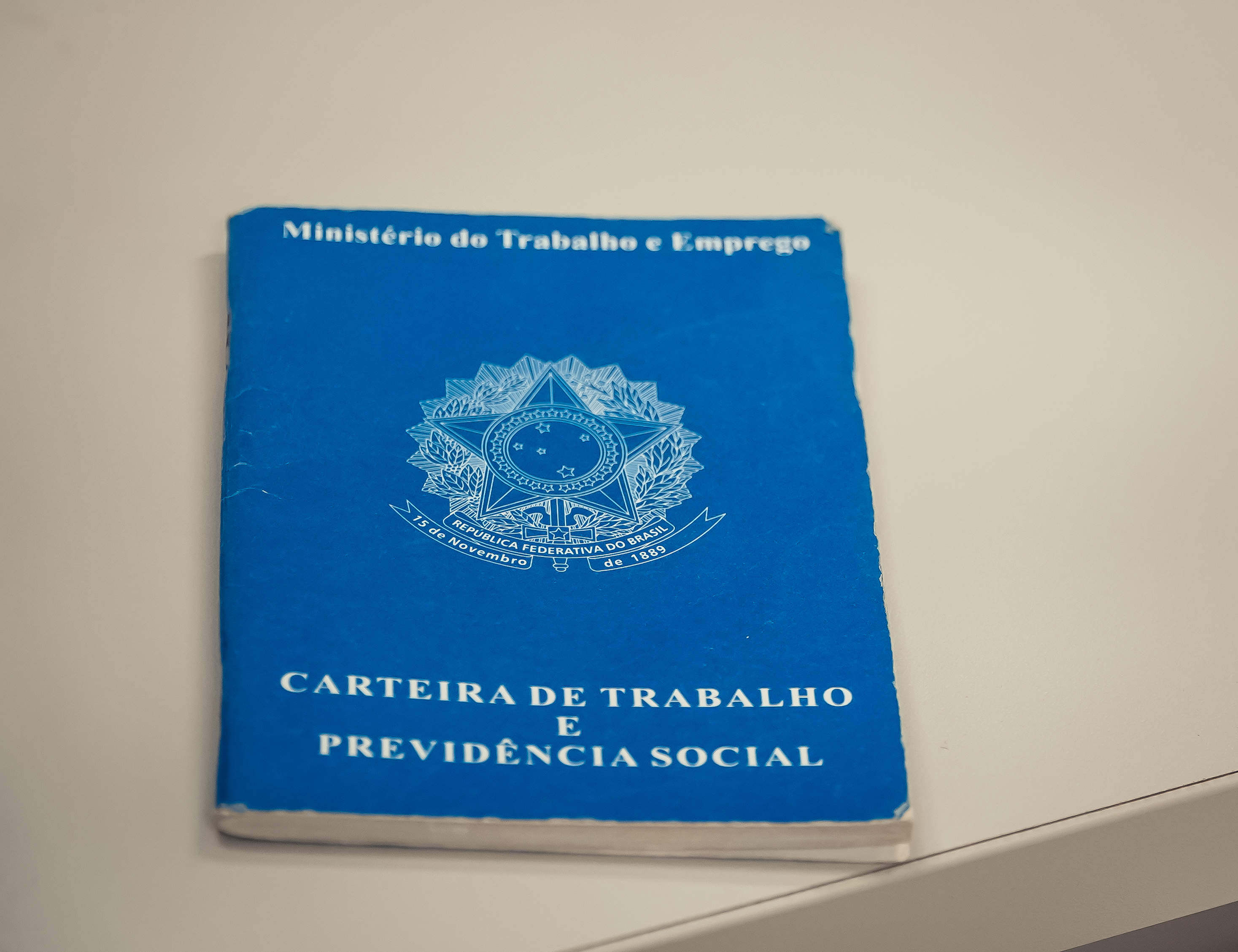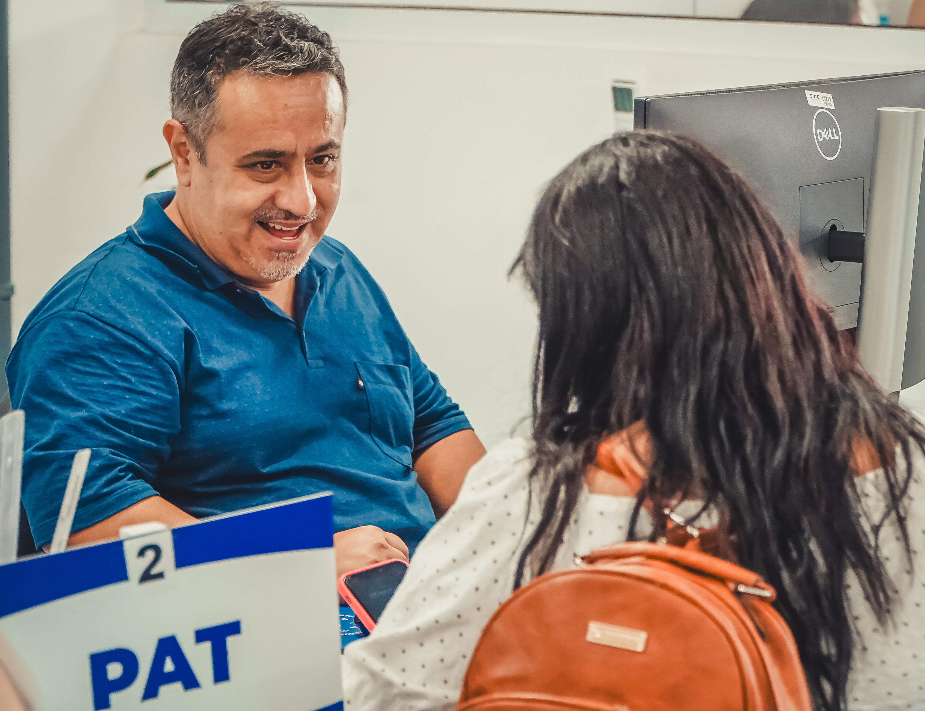#PraTodosVerem: A primeira imagem mostra um atendimento no PAT, com um funcionário analisando documentos enquanto conversa com uma mulher sentada à sua frente. A segunda imagem registra outro atendimento, com um servidor sorrindo durante a orientação a uma participante sentada do outro lado da mesa. A terceira imagem apresenta uma carteira de trabalho posicionada sobre uma superfície. Fim da descrição.