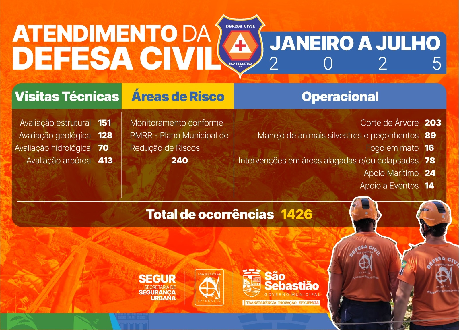 #PraTodosVerem: Card com fundo laranja exibe o balanço de atendimentos da Defesa Civil de São Sebastião entre janeiro e julho de 2025, totalizando 1.426 ocorrências. As imagens mostram agentes uniformizados realizando cortes de árvores caídas, avaliações estruturais e atendimentos em áreas de risco. Fim da descrição.