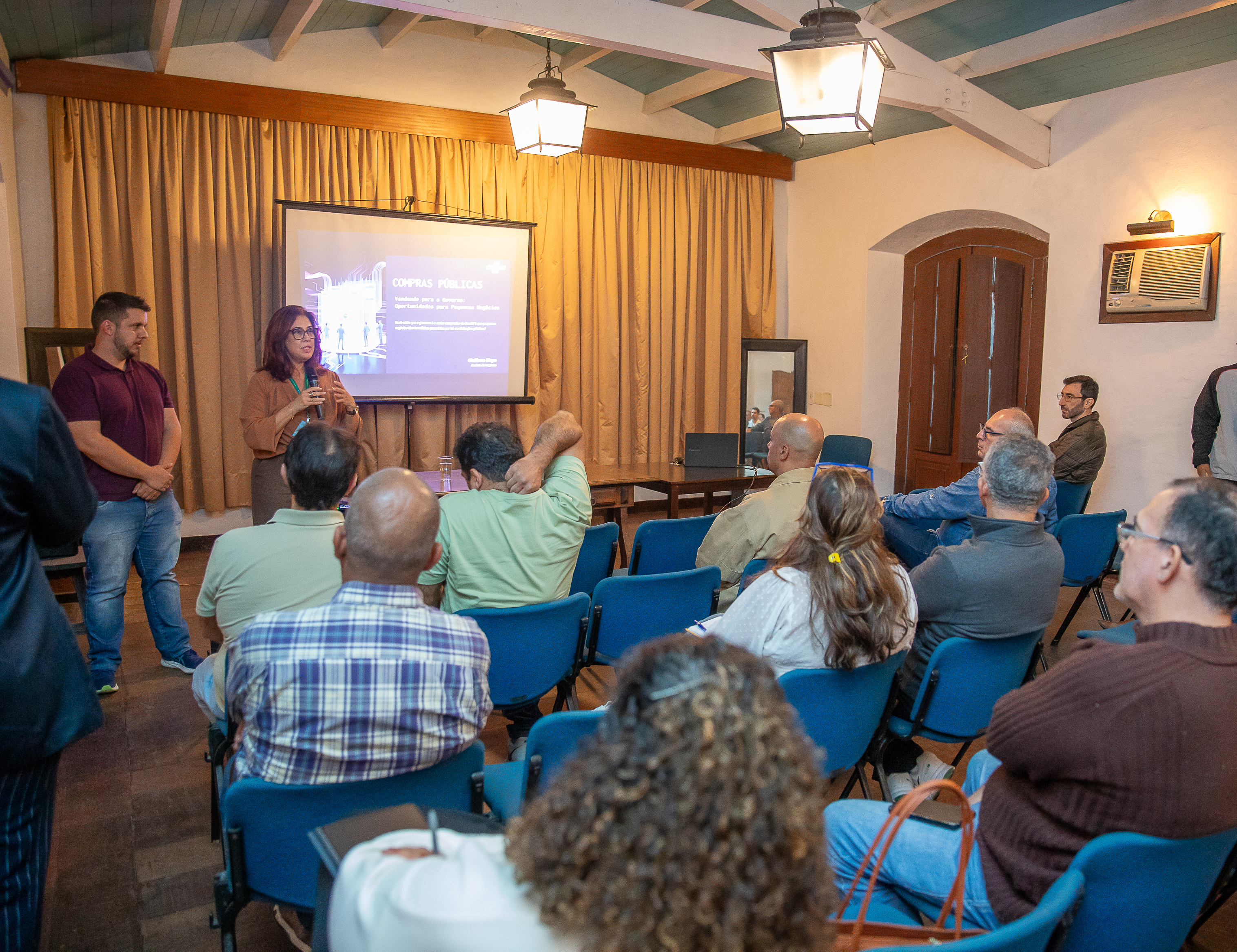 #PraTodosVerem: Imagens mostram uma atividade educativa sobre compras públicas. Em um auditório com cadeiras azuis, pessoas assistem a uma apresentação projetada em tela, com uma mulher falando ao microfone. A iluminação é aconchegante e o ambiente tem teto de madeira aparente. Outra imagem traz um card colorido com informações sobre o curso de compras públicas, destacando data, horário, local e instruções para inscrição via QR Code ou link, além das logomarcas da Prefeitura de São Sebastião. Fim da descrição.