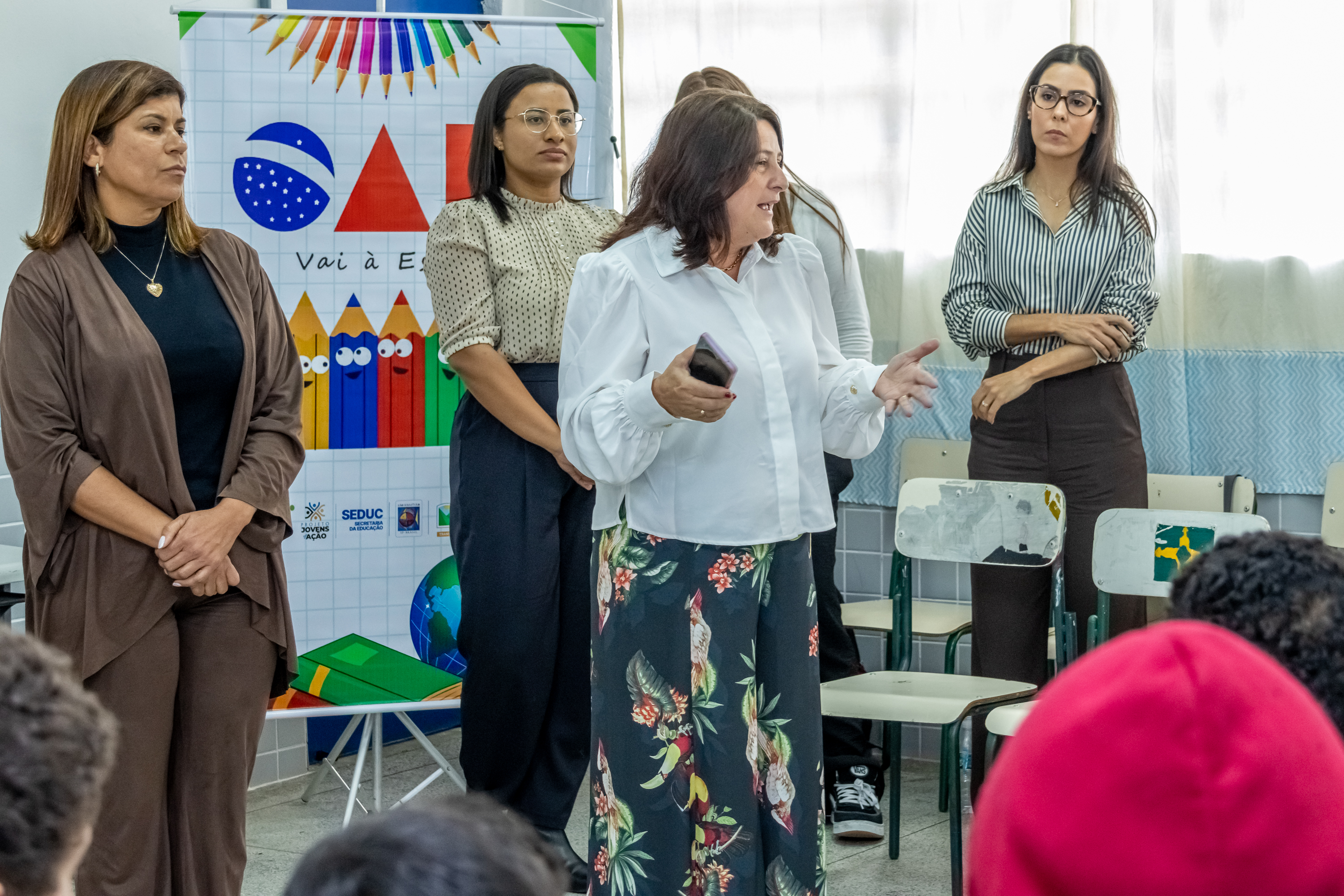 A ação contou com a presença do Juiz da 1ª Vara Cível da Comarca de São Sebastião, Vitor Hugo Aquino de Oliveira; da presidente da Comissão OAB Vai à Escola, Cláudia Cantanhede; e das advogadas Kamilla Assunção e Ananda Leandro de Souza Silva Farias. Pela Secretaria da Educação, estiveram presentes a diretora do Departamento de Ensino, professora Izilda Moreira, e o coordenador do Projeto Jovens em Ação, professor Rafael Romero.