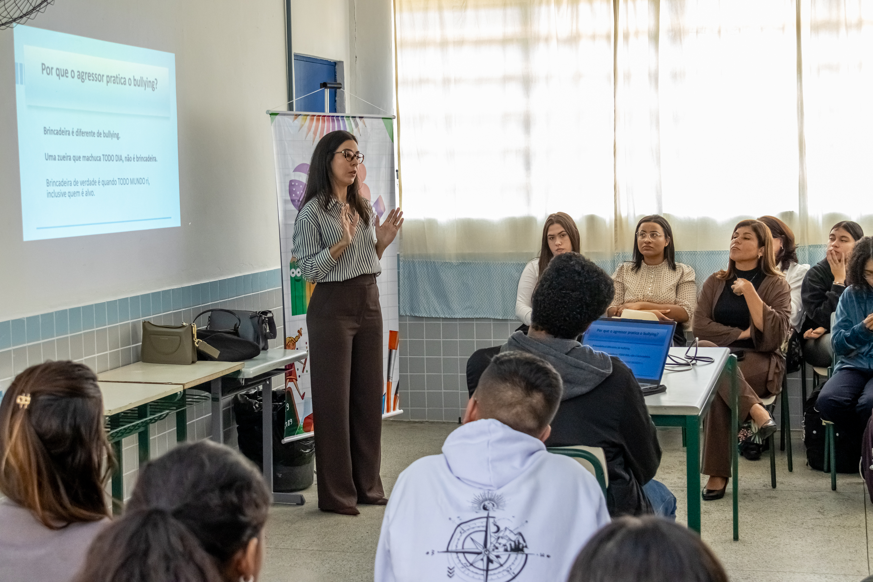Durante o encontro, os estudantes participaram de uma palestra sobre bullying, cyberbullying e funcionamento dos Poderes e das instituições públicas, ministrado pela advogada Kamilla Assunção e o juiz Vitor Hugo Aquino de Oliveira, sendo apresentados os conceitos e consequências destas práticas.