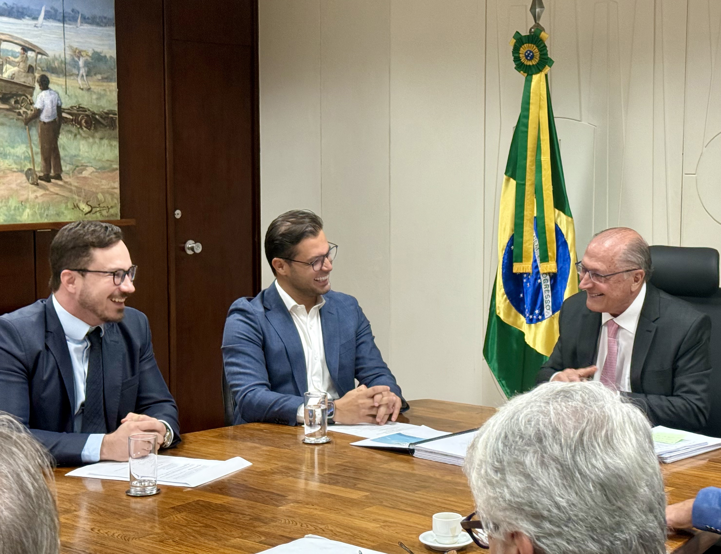 #PraTodosVerem: Em uma sala de reuniões oficial, com bandeira do Brasil ao fundo, o prefeito Reinaldinho Moreira aparece em encontro com o vice-presidente da República, Geraldo Alckmin. Na primeira imagem, os dois estão sentados frente a frente à mesa, em diálogo. Depois, ambos sorriem, acompanhados por outros homens de terno, durante a reunião. Sobre a mesa, há copos de água, papéis, cadernos e uma pasta com documentos. Ao fundo, um quadro retrata uma cena rural. Fim da descrição