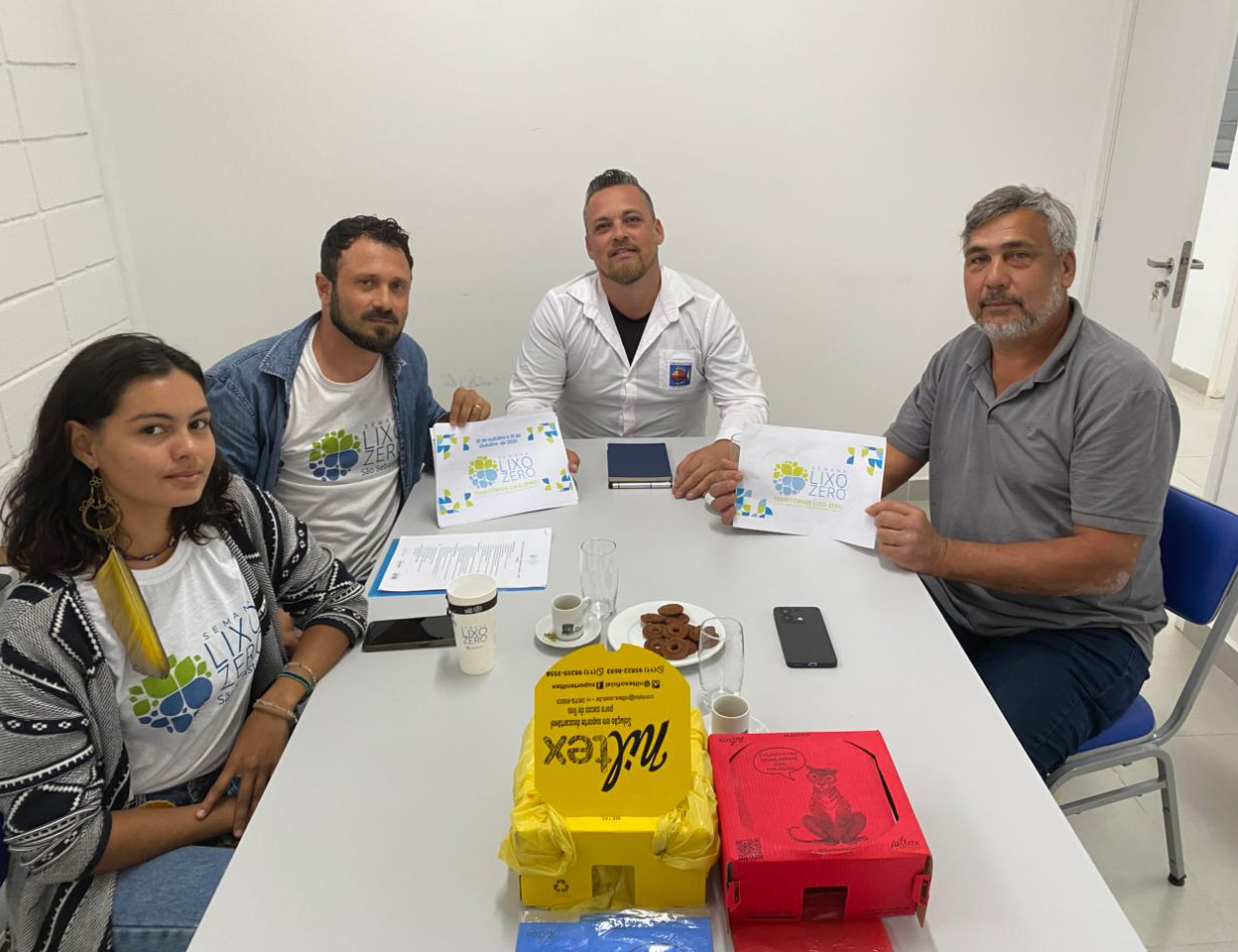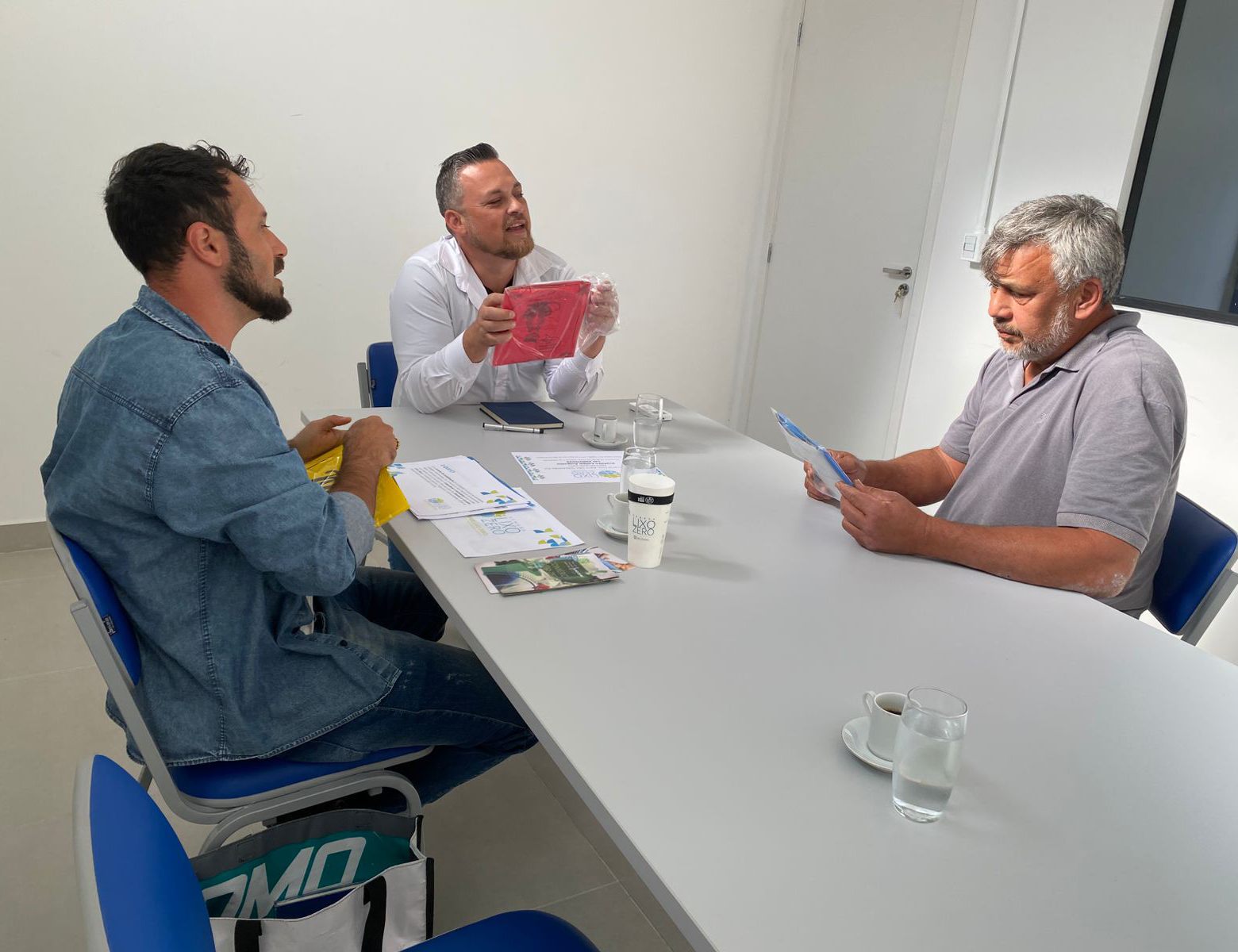 #PraTodosVerem: as imagens registram uma reunião entre servidores da Secretaria de Serviços Públicos e representantes do Instituto Lixo Zero Brasil e do Coletivo São Sebastião Lixo Zero, realizada em um ambiente de escritório claro e organizado. Durante o encontro, os participantes discutem documentos, trocam materiais informativos e compartilham ideias voltadas à promoção da sustentabilidade e da gestão consciente de resíduos. As camisetas com a logo "Lixo Zero", os materiais visuais e a interação entre os presentes reforçam o foco no fortalecimento de ações colaborativas em prol de uma cidade mais limpa e comprometida com o meio ambiente. Fim da descrição.