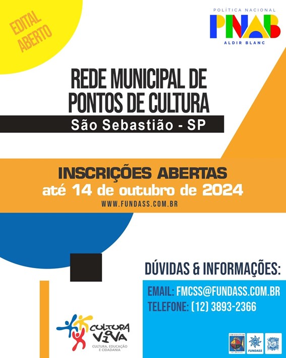 As inscrições seguem abertas do Edital para o desenvolvimento da Rede Municipal de Pontos de Cultura de São Sebastião, por meio da Política Nacional de Cultura Viva (PNCV), instituída pela Lei nº 13.018, de 22 de julho de 2014.