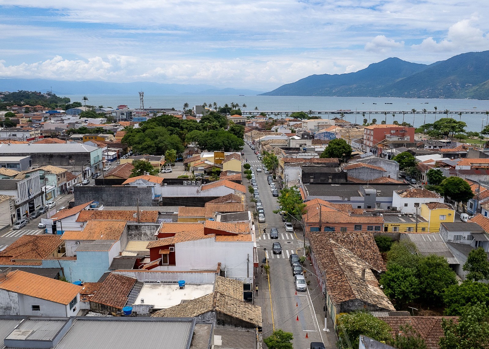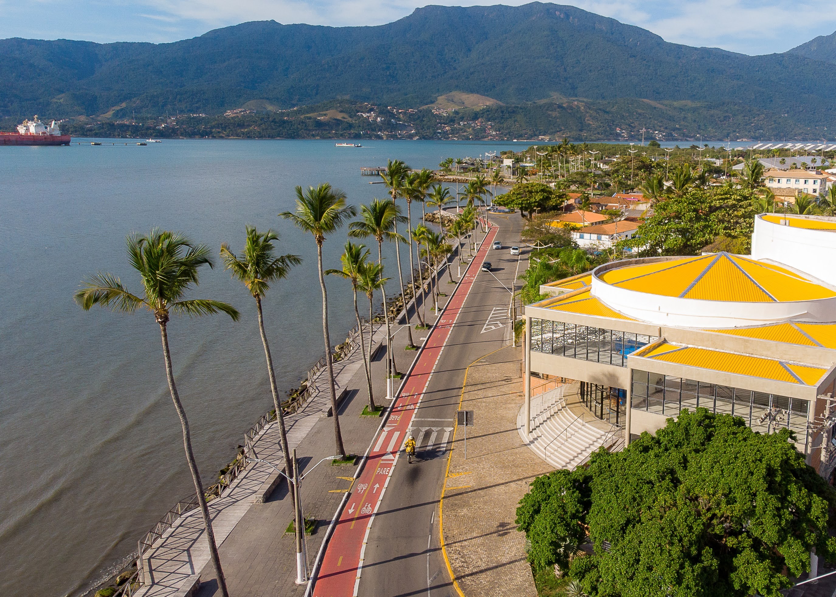 #PraTodosVerem: imagens aéreas mostram diferentes regiões urbanas e áreas de lazer de São Sebastião. É possível observar estruturas industriais, vias comerciais com grande movimentação, prédios residenciais e comerciais, além de uma extensa área de lazer à beira-mar, com quadras esportivas, brinquedos de parque e ciclovia. Ao fundo, o mar e as montanhas completam a paisagem, destacando a integração entre natureza e desenvolvimento urbano. Fim da descrição.