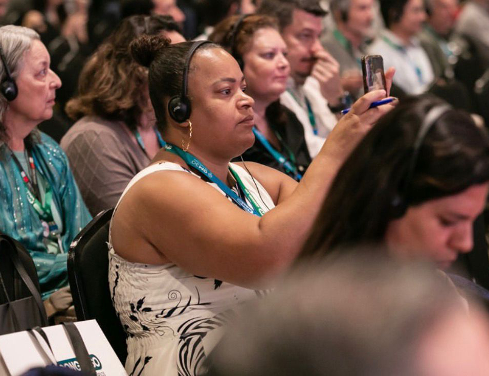 #PraTodosVerem: Imagens mostram a participação de São Sebastião em evento institucional de turismo. Em um estande, um homem apresenta materiais informativos e um óculos de realidade virtual; em outra cena, uma mulher utiliza o equipamento. Há também um painel com debatedores em um palco e, por fim, o público acompanha a programação, com alguns participantes utilizando fones de tradução. Fim da descrição.