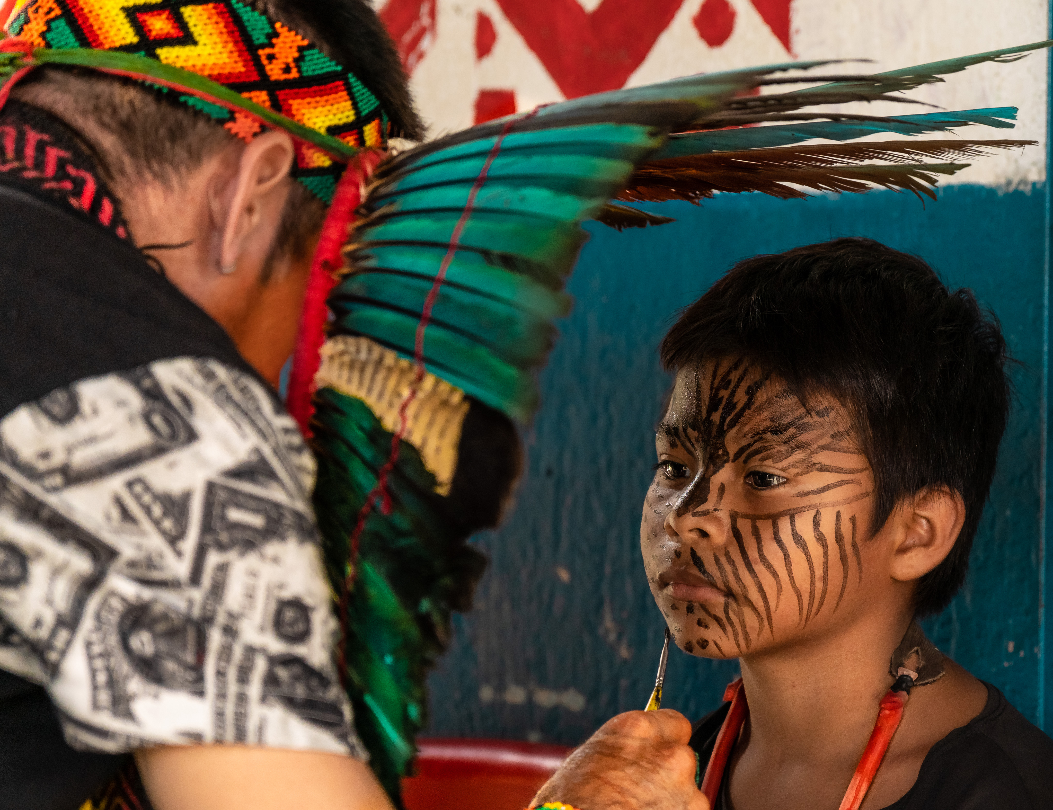 #PraTodosVerem: Imagens mostram momentos do cotidiano em uma aldeia indígena, com uma criança recebendo pintura corporal no rosto, um homem produzindo artesanato com fibras coloridas diante de cestos tradicionais e uma apresentação cultural ao ar livre, com um jovem realizando um salto enquanto outras pessoas observam em meio à natureza. Fim da descrição.