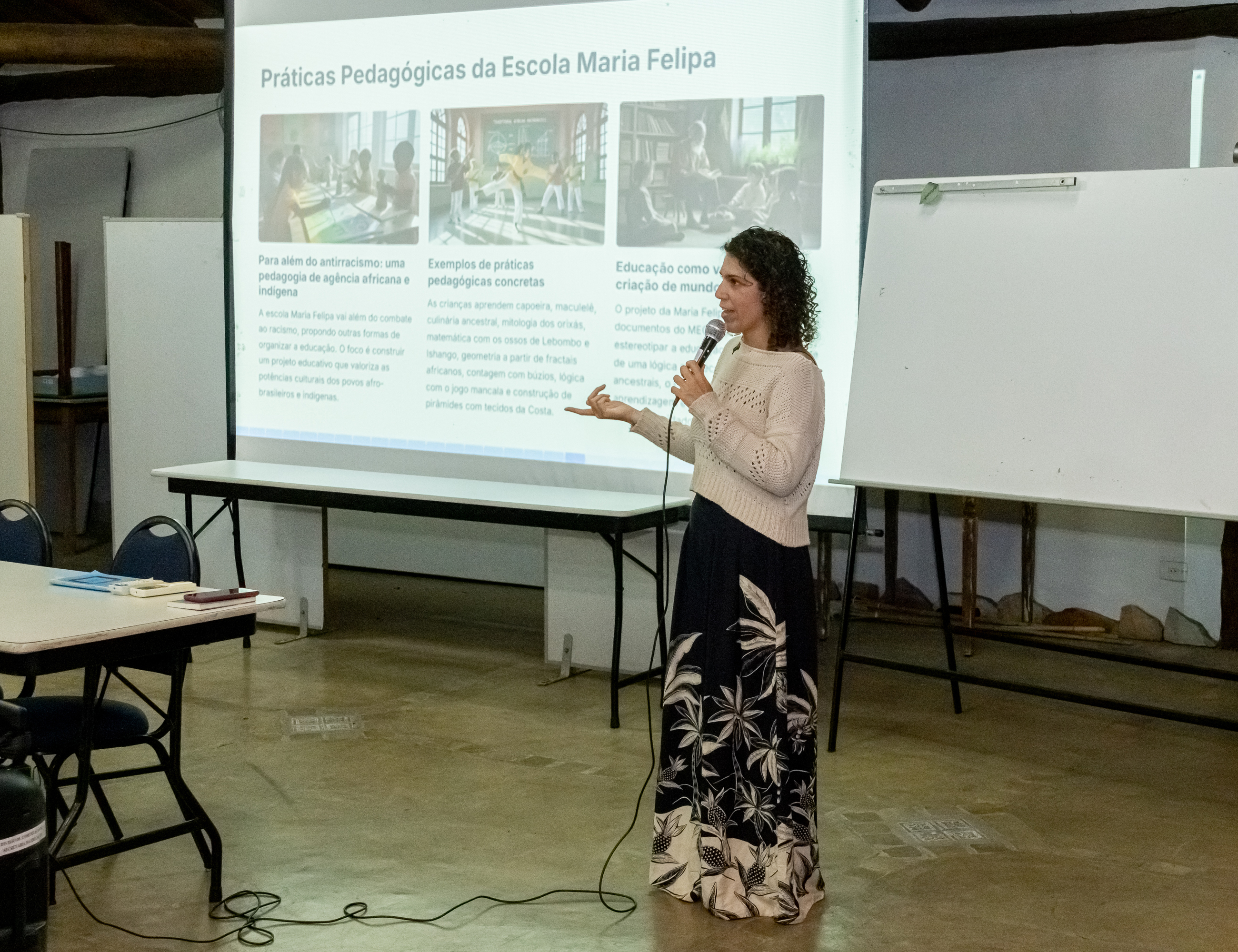 #PraTodosVerem: quatro fotos mostram a formação continuada de professores com foco em práticas pedagógicas antirracistas. Em uma das imagens, uma mulher fala ao microfone em frente a um projetor com o tema “Por que precisamos falar de educação antirracista na infância?”. Em outra, ela aponta para a tela onde se lê “Práticas Pedagógicas da Escola Maria Felipa”. A terceira imagem mostra o público atento, sentado em cadeiras num espaço amplo com teto de madeira. A última foto registra duas mulheres lado a lado ao final da apresentação. Fim da descrição.