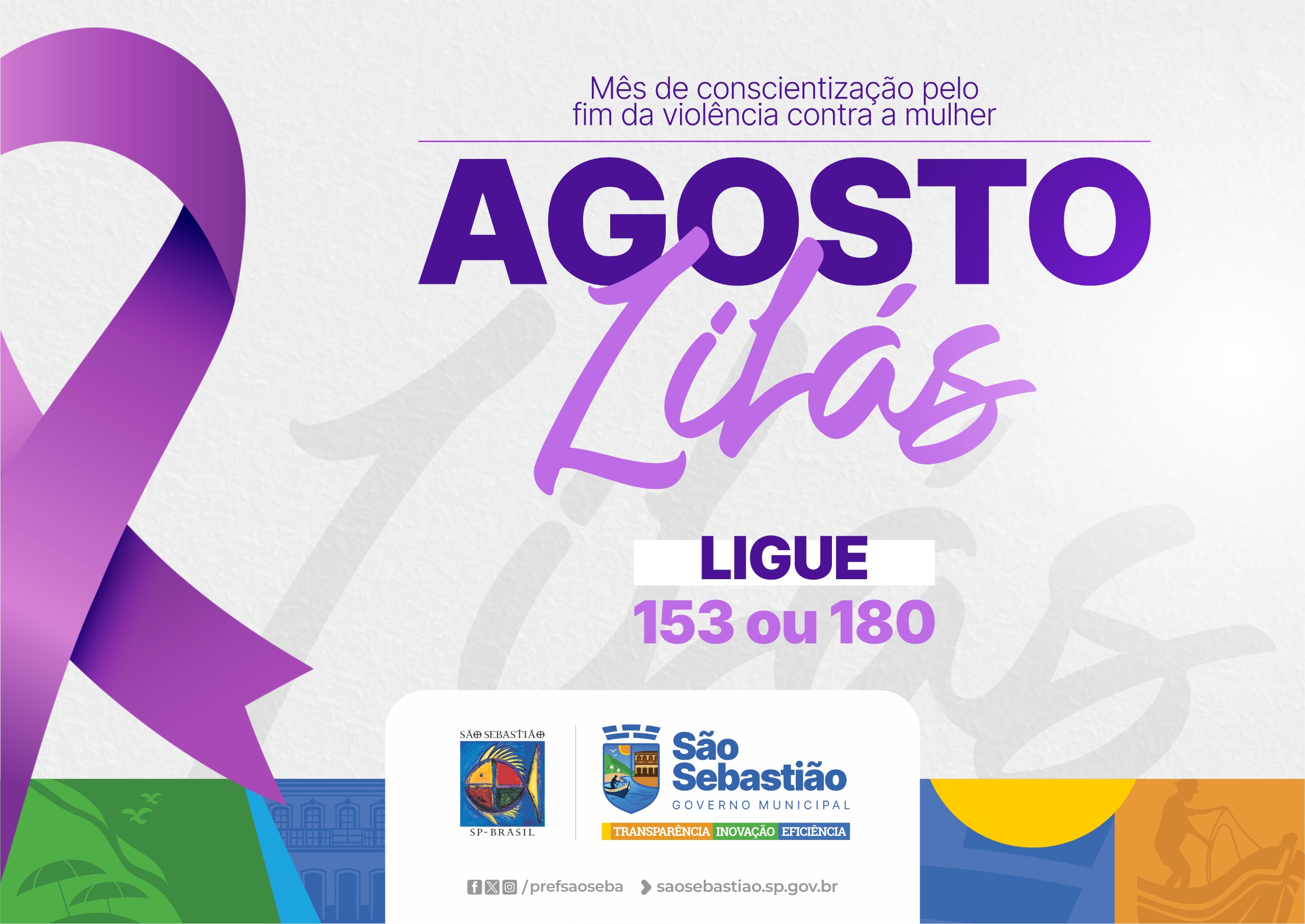 #PraTodosVerem: card com fundo claro e elementos gráficos coloridos nas bordas, destacando o laço roxo do lado esquerdo — símbolo da campanha Agosto Lilás. Ao centro, em destaque, está escrito "Agosto Lilás" em letras grandes nas cores roxa e lilás. Acima, a frase: "Mês de conscientização pelo fim da violência contra a mulher". Abaixo, a orientação: "LIGUE 153 ou 180". No rodapé, aparecem os logotipos da Prefeitura de São Sebastião, com os dizeres “Transparência, Inovação, Eficiência”, e os ícones das redes sociais e site oficial.