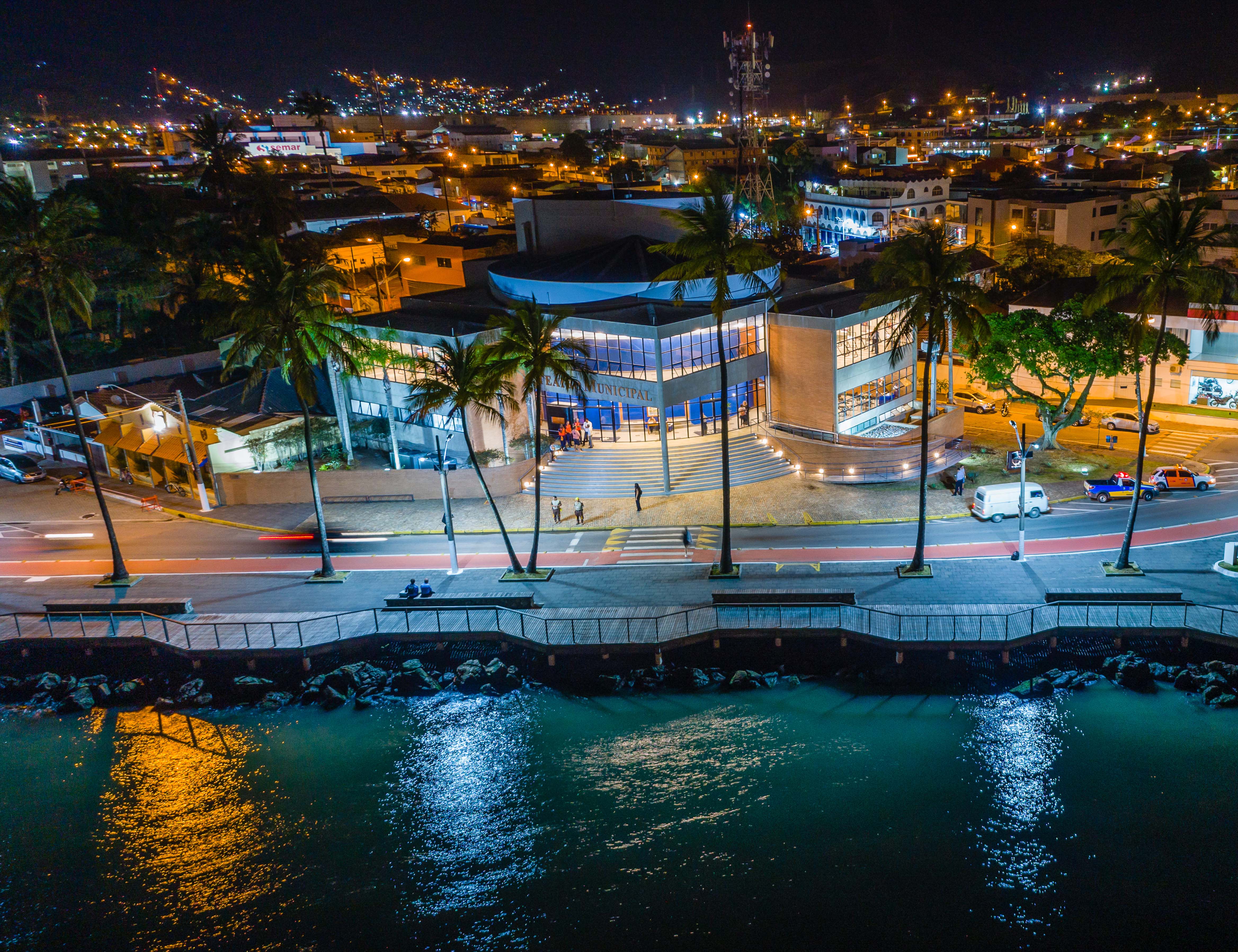 #PraTodosVerem: sequência de fotos do Centro Histórico de São Sebastião. As imagens mostram o Teatro Municipal iluminado à noite, o coreto e a igreja matriz cercados por árvores, e vistas aéreas da orla da Rua da Praia com praça, píer, mar e montanhas ao fundo. Fim da descrição.