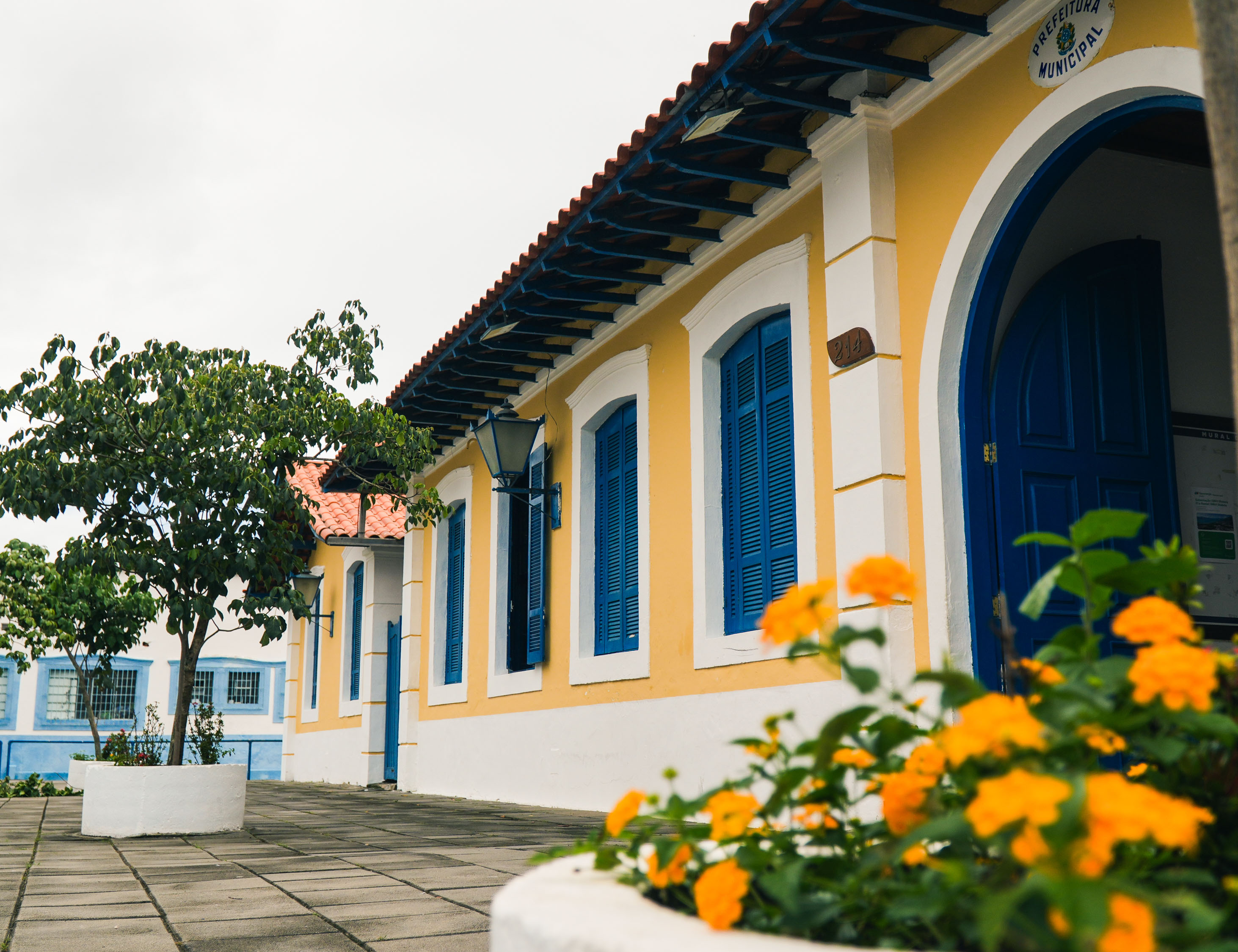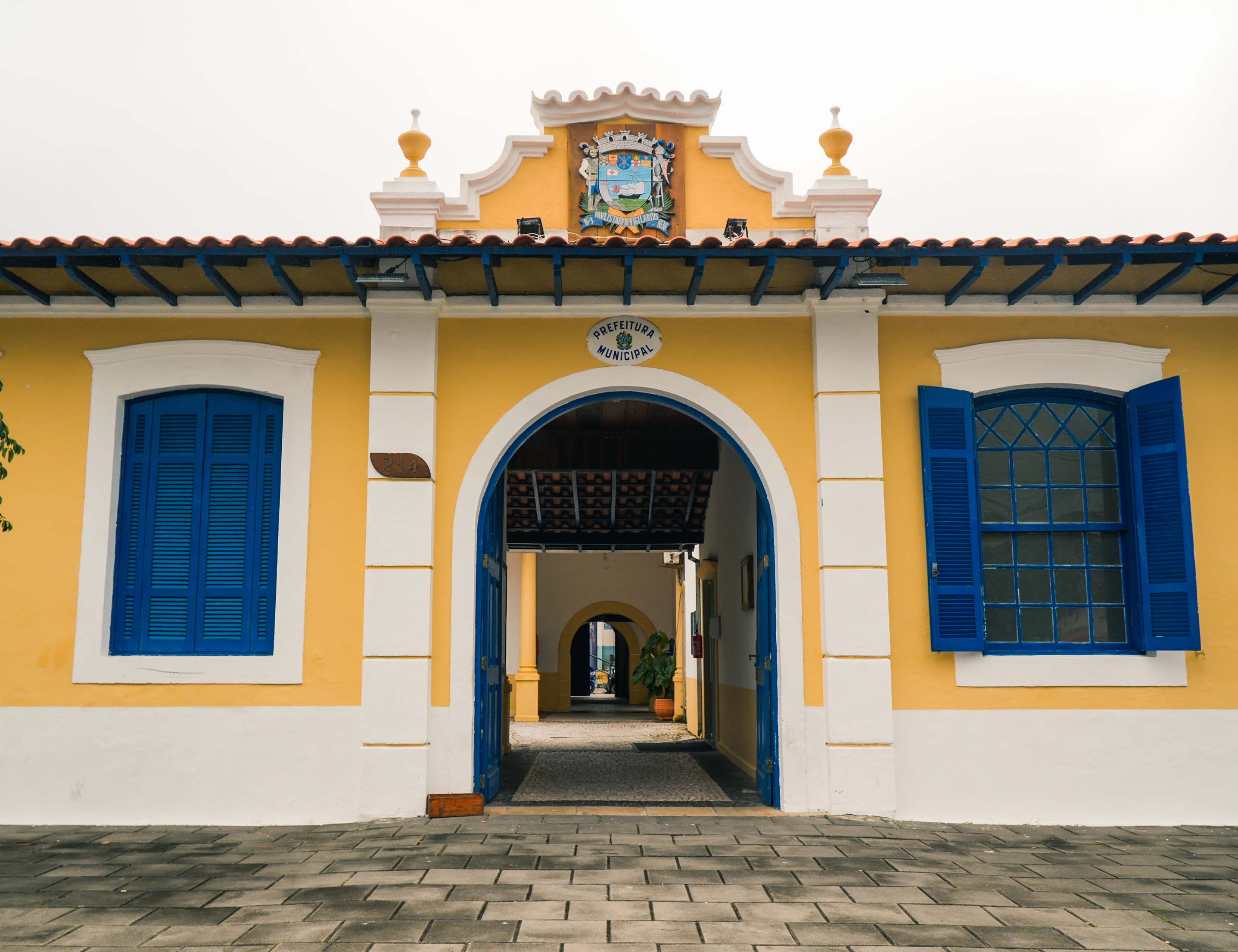 #PraTodosVerem: As imagens mostram a frente do paço municipal, nas cores amarelo, azul e branco. Fim da descrição.