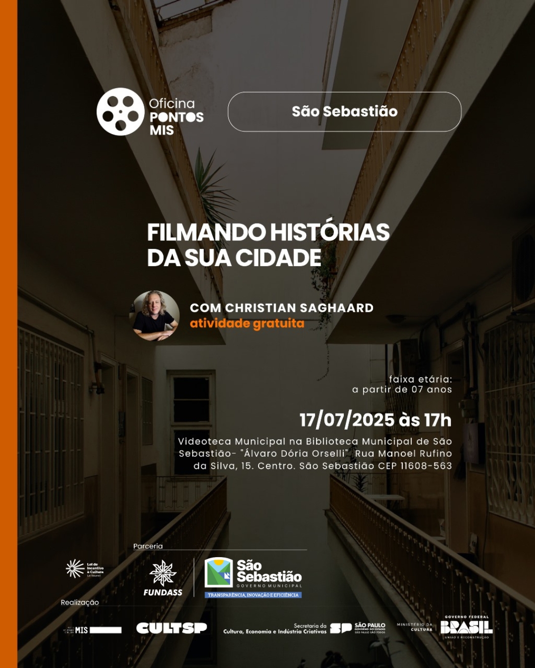 A Prefeitura de São Sebastião, por meio da Fundação Educacional e Cultural ‘Deodato Sant’Anna’ (Fundass), em parceria com a Secretaria de Cultura e Economia Criativa do Governo do Estado de São Paulo e o Pontos MIS, oferecem gratuitamente, no dia 17 de julho (quinta-feira), a Oficina ‘Filmando histórias da sua cidade - Faça um filme inspirado nas histórias e lendas da sua cidade’, ministrada pelo cineasta Christian Saghaard.