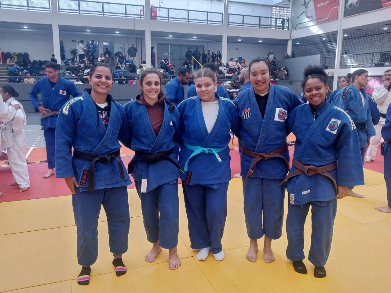 #PraTodosVerem: Atletas e técnicos de judô de São Sebastião posam sorridentes durante a participação nos Jogos Regionais, celebrando o espírito de equipe e as conquistas na competição. As imagens mostram momentos de união e orgulho, com destaque para duas judocas medalhistas exibindo suas conquistas ao lado da equipe técnica, incluindo uma atleta que segura uma criança no colo. Em outra cena, cinco atletas da equipe feminina, todas com quimonos azuis, posam lado a lado no tatame, demonstrando camaradagem e foco. A equipe completa também é registrada reunida para uma foto oficial, com homens e mulheres organizados em duas fileiras, transmitindo o sentimento de pertencimento e superação que o judô proporciona. Fim da descrição.
