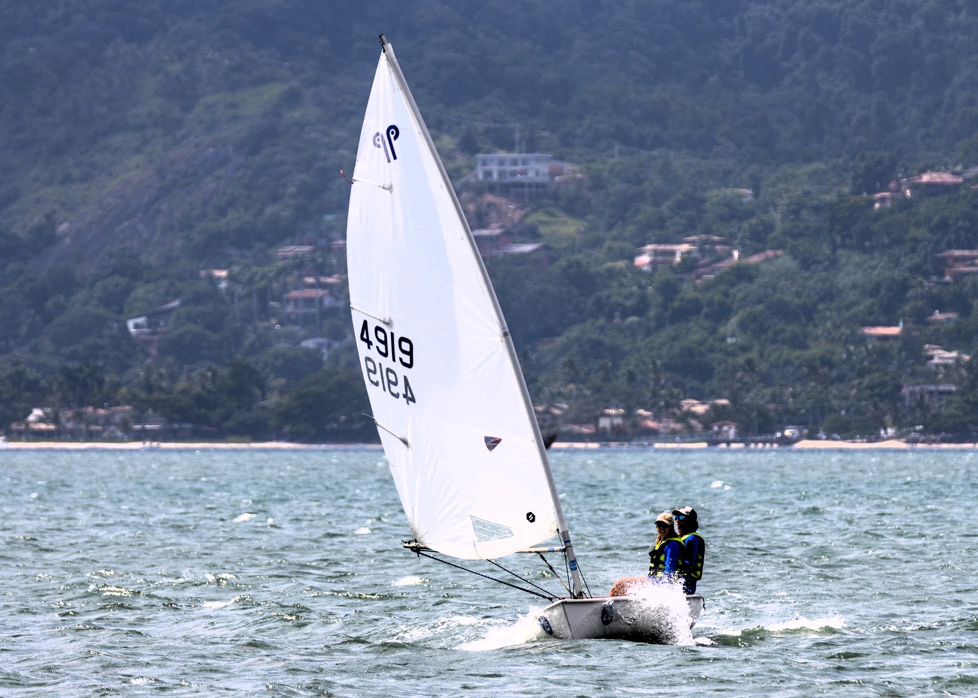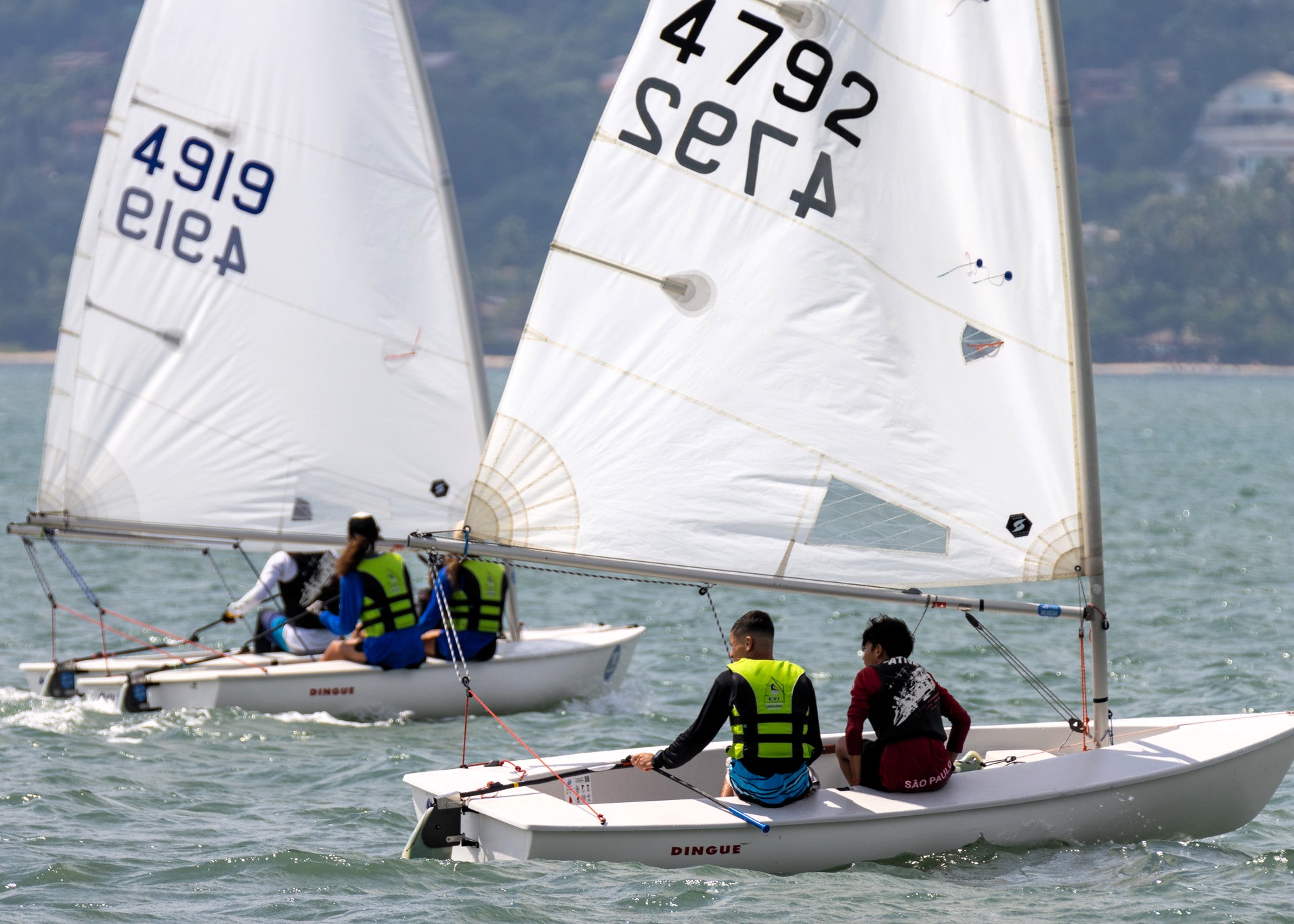 #PraTodosVerem: As imagens registram velejadores durante uma competição de vela, em São Sebastião, navegando pelas águas do Canal com o cenário verde da serra ao fundo. As embarcações de vela branca cortam o mar sob céu ensolarado, conduzidas por atletas que demonstram técnica e concentração. É possível ver duplas e grupos participando das provas, com coletes salva-vidas coloridos e vento forte impulsionando as velas. Fim da descrição.