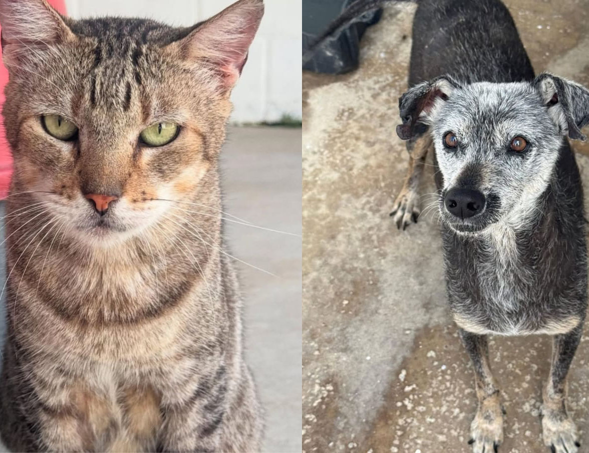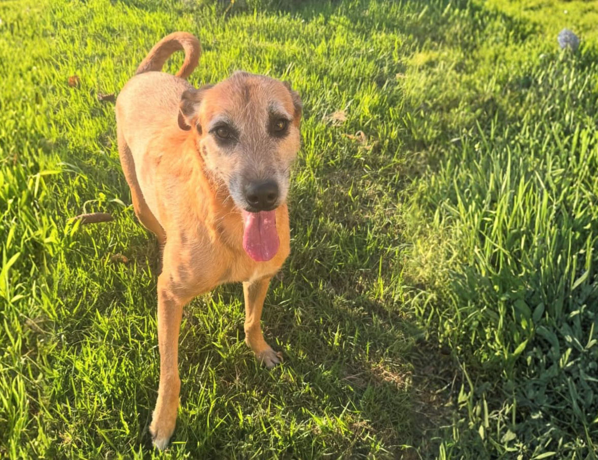 #PraTodosVerem: Um cachorro de porte médio e pelagem marrom clara aparece sobre a grama, com a língua de fora e iluminado pelo sol. Um gato rajado de olhos verdes e um cachorro de pelos grisalhos olham para a câmera em ambientes diferentes. Ao fundo, a fachada amarela do prédio do Centro de Controle de Zoonoses de São Sebastião, com letras azuis, jardim e céu parcialmente nublado. Fim da descrição.