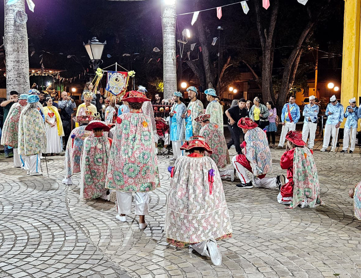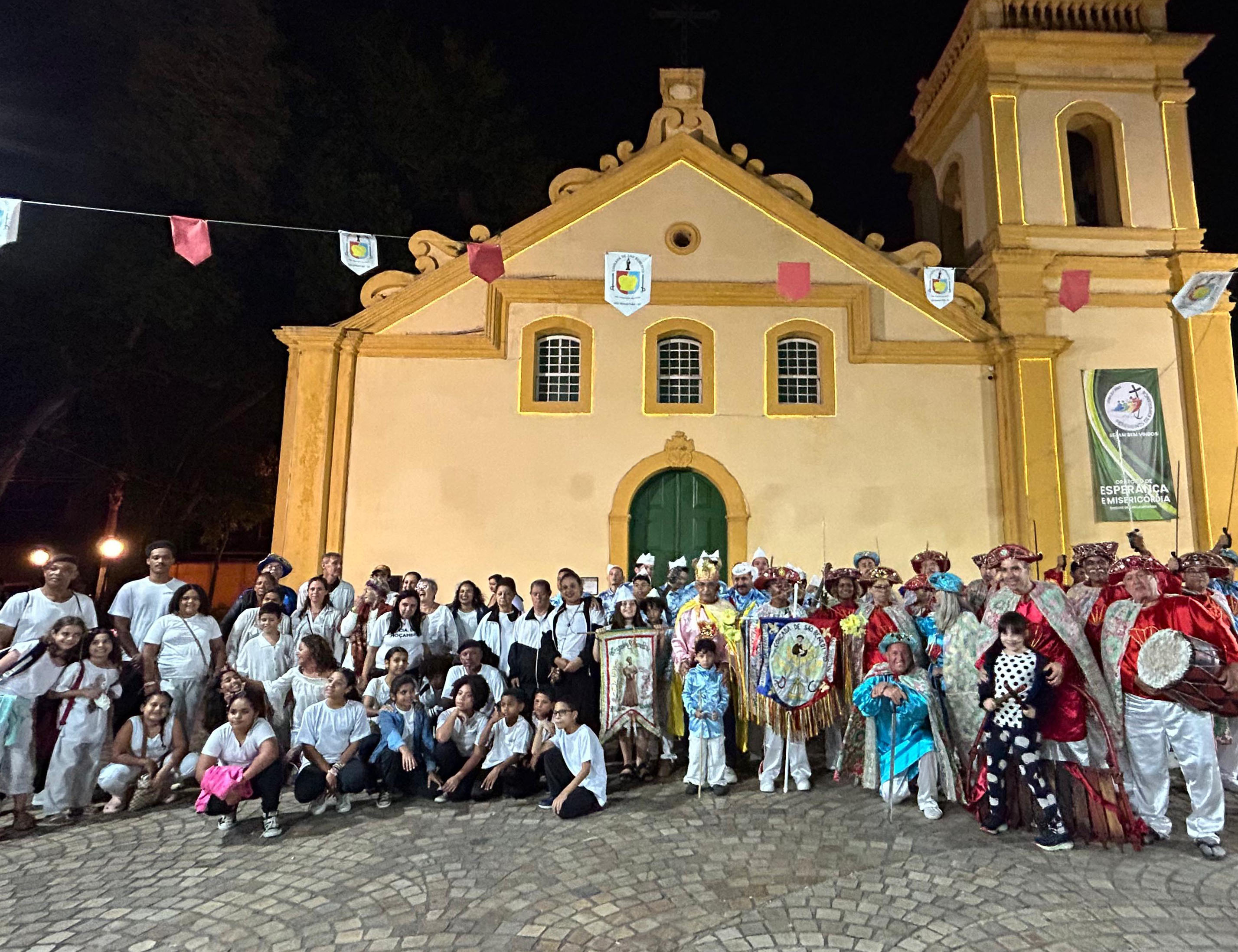 #PraTodosVerem: Três fotos registram a celebração da Congada em frente a uma igreja amarela à noite. Na primeira, o grupo usa túnicas vermelhas e capas floridas enquanto encena uma luta com bastões sobre o piso de pedras. A segunda mostra os integrantes ajoelhados em círculo próximo a estandartes religiosos. A terceira é uma foto coletiva com participantes de várias idades, incluindo crianças, segurando bandeiras e instrumentos. Todos vestem trajes tradicionais e chapéus decorados sob bandeirinhas coloridas. Fim da descrição.