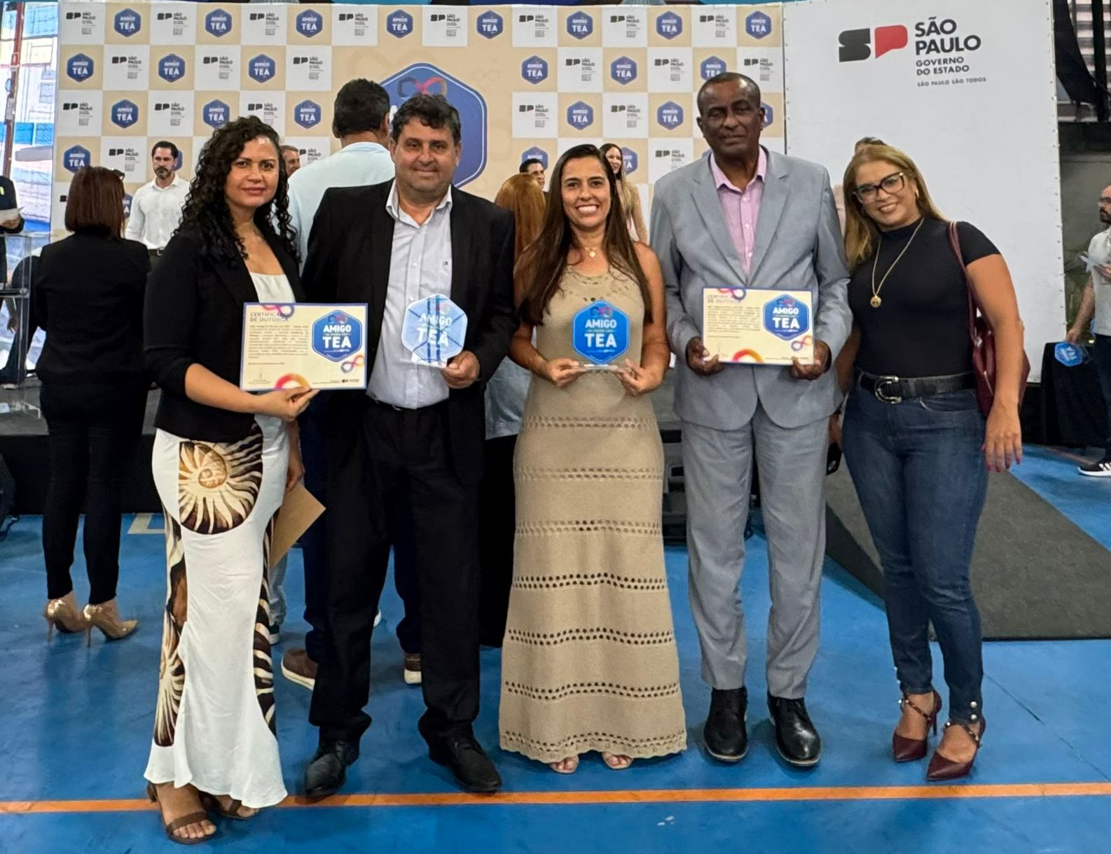 #PraTodosVerem: imagem de homens e mulheres, autoridades e assessores com a certificado do Selo Amigo TEA, em mãos, e mais uma imagem com mais representantes, homens e mulheres com os certificados. Fim da descrição.
