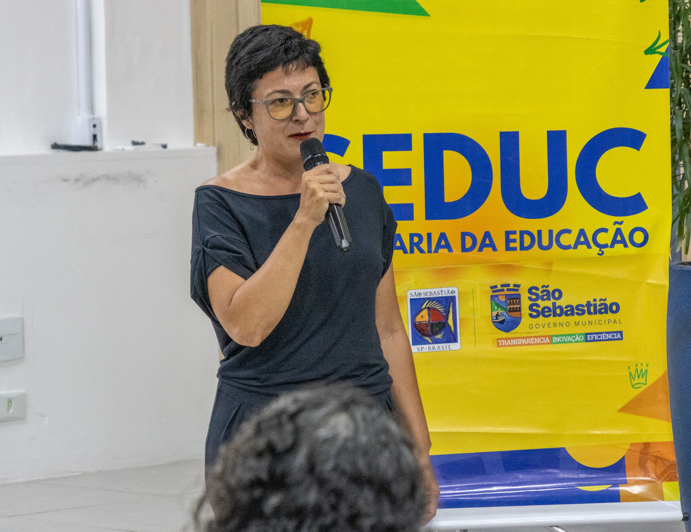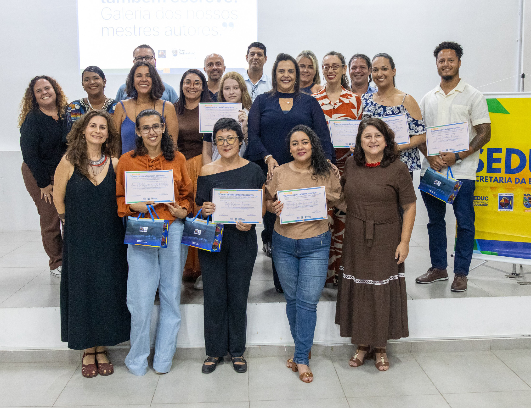 #PraTodosVerem: Em uma cerimônia da Secretaria da Educação de São Sebastião, diversos profissionais da educação posam sorridentes em um auditório iluminado, alguns segurando certificados e pequenas sacolas de premiação; ao fundo, há uma tela de projeção com frase alusiva aos autores e um painel amarelo com o logo da SEDUC. Em outras imagens, educadoras se revezam ao microfone para falar ao público, posicionadas ao lado do painel oficial da secretaria. A plateia, sentada em fileiras de cadeiras pretas, acompanha atentamente as falas durante o evento. Fim da descrição.