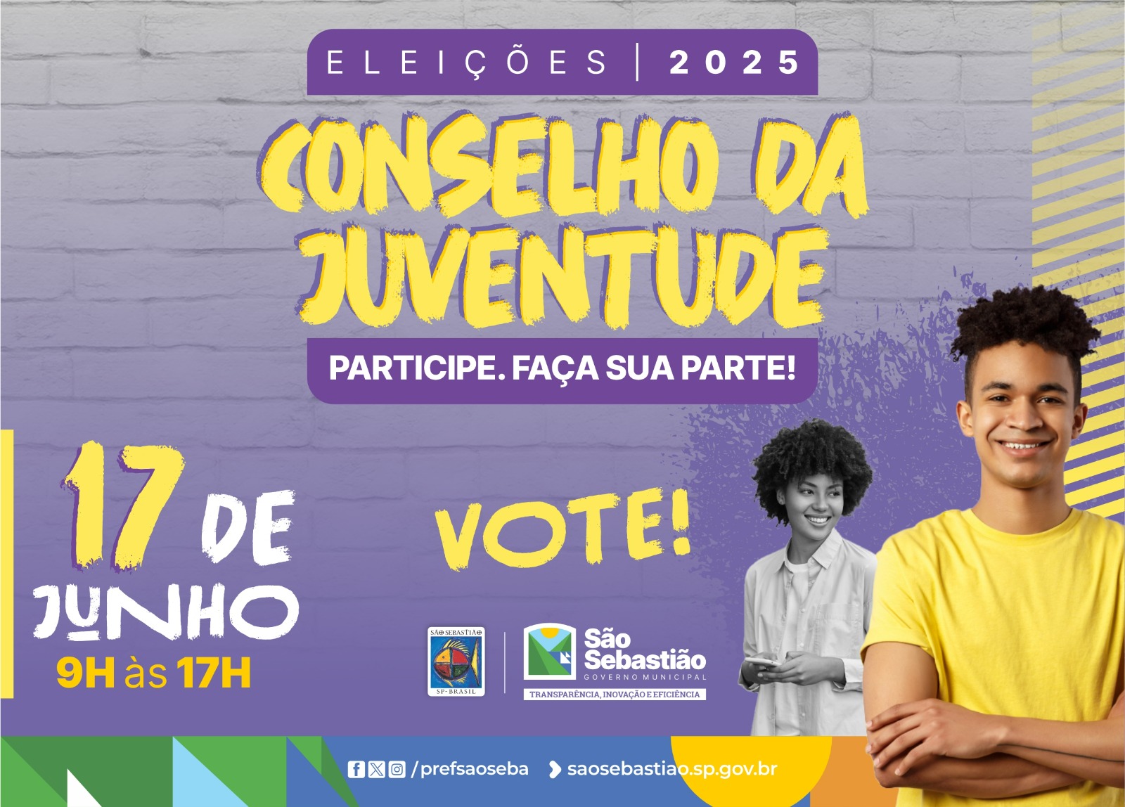 #PraTodosVerem: card colorido de divulgação da eleição para o Conselho da Juventude 2025 de São Sebastião, com fundo em tons de roxo e cinza, imitando uma parede de tijolos. No topo, está escrito: "ELEIÇÕES 2025". Em letras grandes e amarelas, lê-se "CONSELHO DA JUVENTUDE". Logo abaixo, em uma faixa roxa: "PARTICIPE. FAÇA SUA PARTE!". À esquerda, em letras grandes e amarelas com detalhes brancos, aparece a data: "17 de junho", seguida do horário: "9h às 17h". Ao centro, em letras amarelas, está a palavra "VOTE!". À direita, há a imagem de dois jovens: um rapaz sorrindo, em cores, com camiseta amarela, e uma jovem ao fundo, em preto e branco, sorrindo e segurando um celular. Na parte inferior estão os logos da Prefeitura de São Sebastião e do governo municipal, com o lema “Transparência, Inovação e Eficiência”, além dos ícones de redes sociais e o site: saosebastiao.sp.gov.br. Fim da descrição.