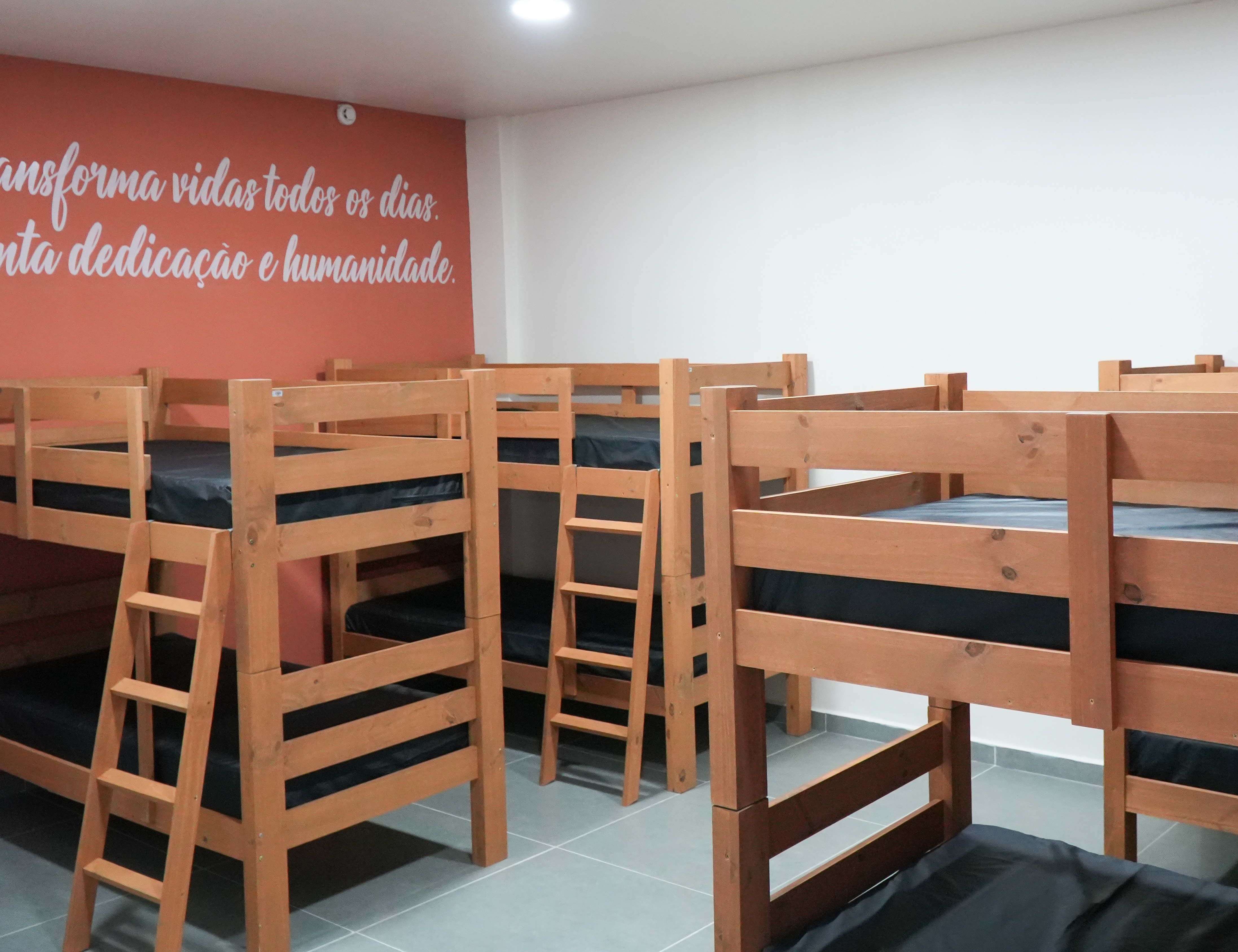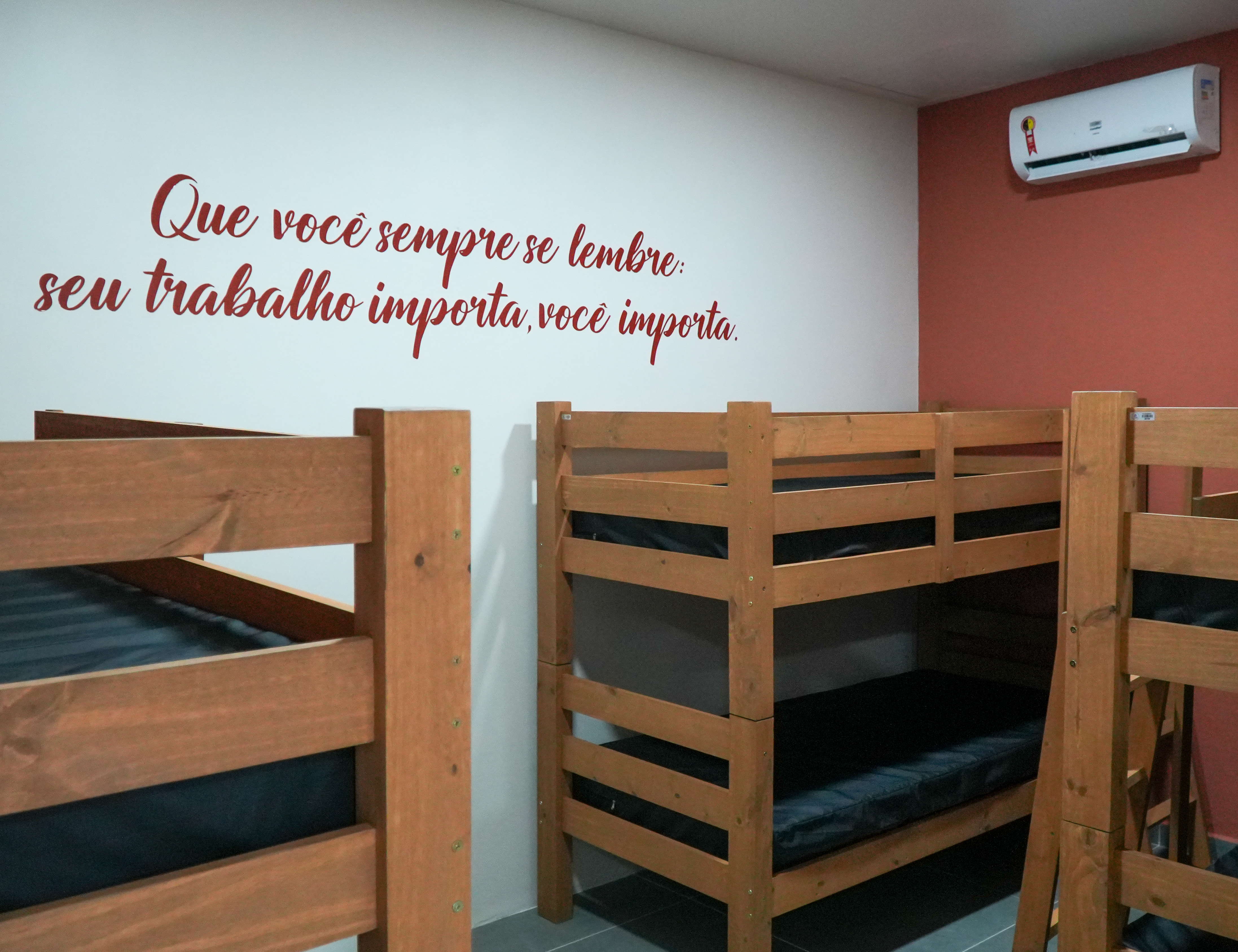 #PraTodosVerem: A sequência de três imagens apresenta a nova Sala de Descompressão para a Enfermagem Masculina de uma unidade de saúde, composta por um dormitório organizado com diversas beliches de madeira clara e colchões revestidos em material escuro. O ambiente possui iluminação embutida no teto, piso frio cinza e paredes brancas, destacando-se uma parede de fundo na cor terracota com frases motivacionais em letras brancas cursivas; acima da porta de entrada, uma placa de identificação exibe o nome do espaço e o logotipo institucional sobre um fundo branco. Fim da descrição.