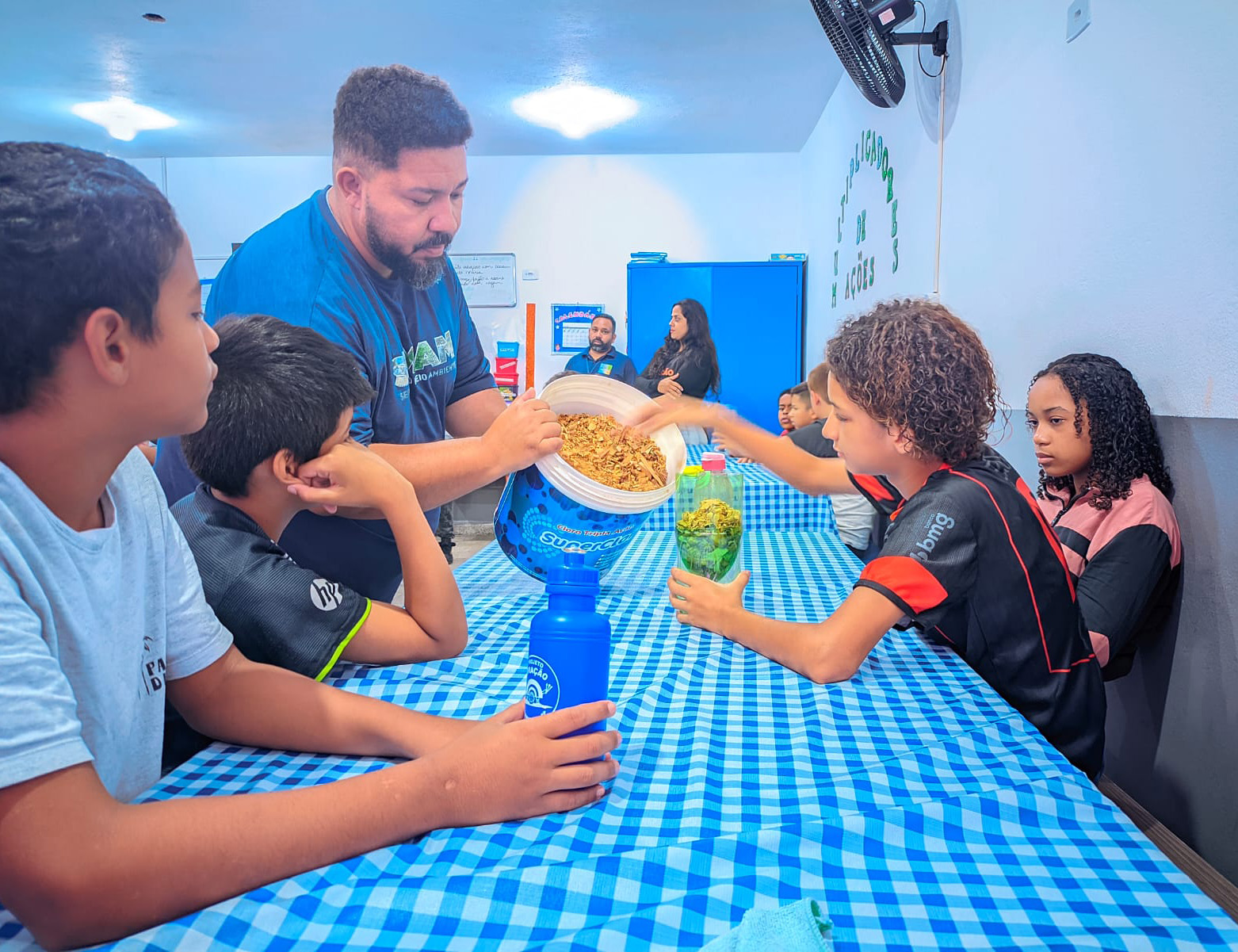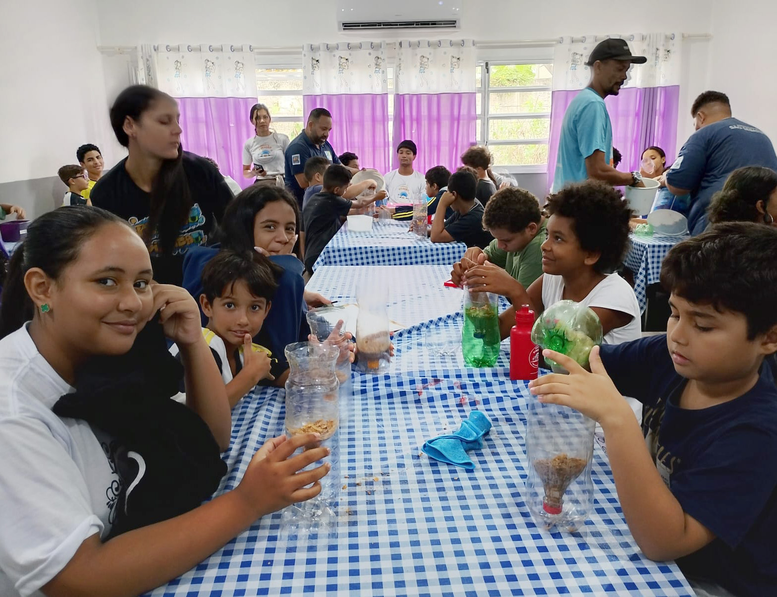 #PraTodosVerem: As imagens mostram um grupo de crianças e adolescentes participando de uma oficina de educação ambiental em uma sala com mesas cobertas por toalhas xadrez azuis e brancas. Adultos vestindo uniformes da Secretaria de Meio Ambiente (Semam) orientam os jovens, que utilizam garrafas plásticas reaproveitadas para criar sistemas de compostagem, manuseando substrato orgânico seco. Fim da descrição.