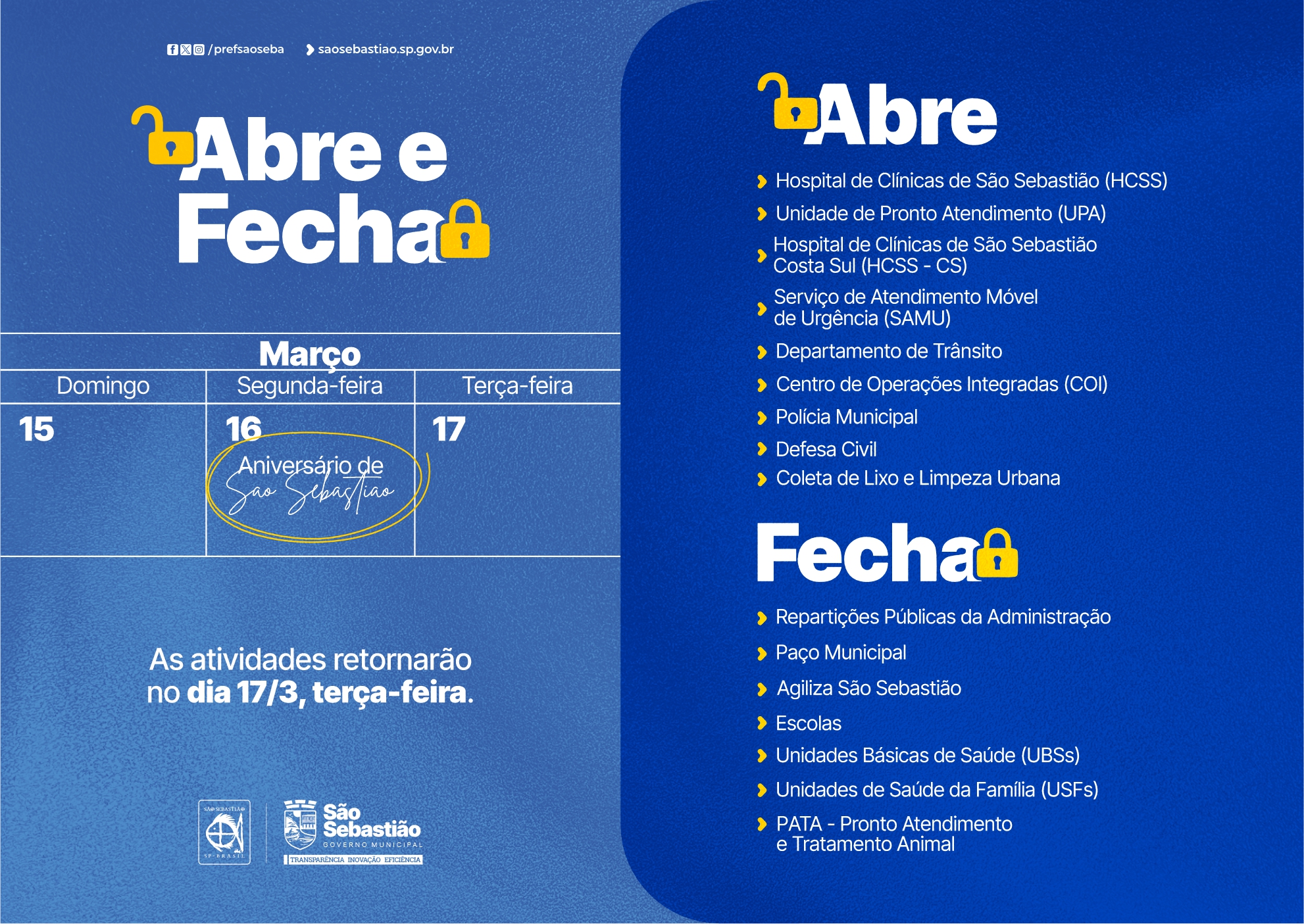 A Prefeitura de São Sebastião terá horários especiais de funcionamento dos serviços públicos durante o feriado de 390 anos de Emancipação Político-Administrativa da cidade, celebrado nesta segunda-feira (16/3). O expediente nas repartições públicas será encerrado na sexta-feira (13/3) e retomado na terça-feira (17/3), em horário normal.