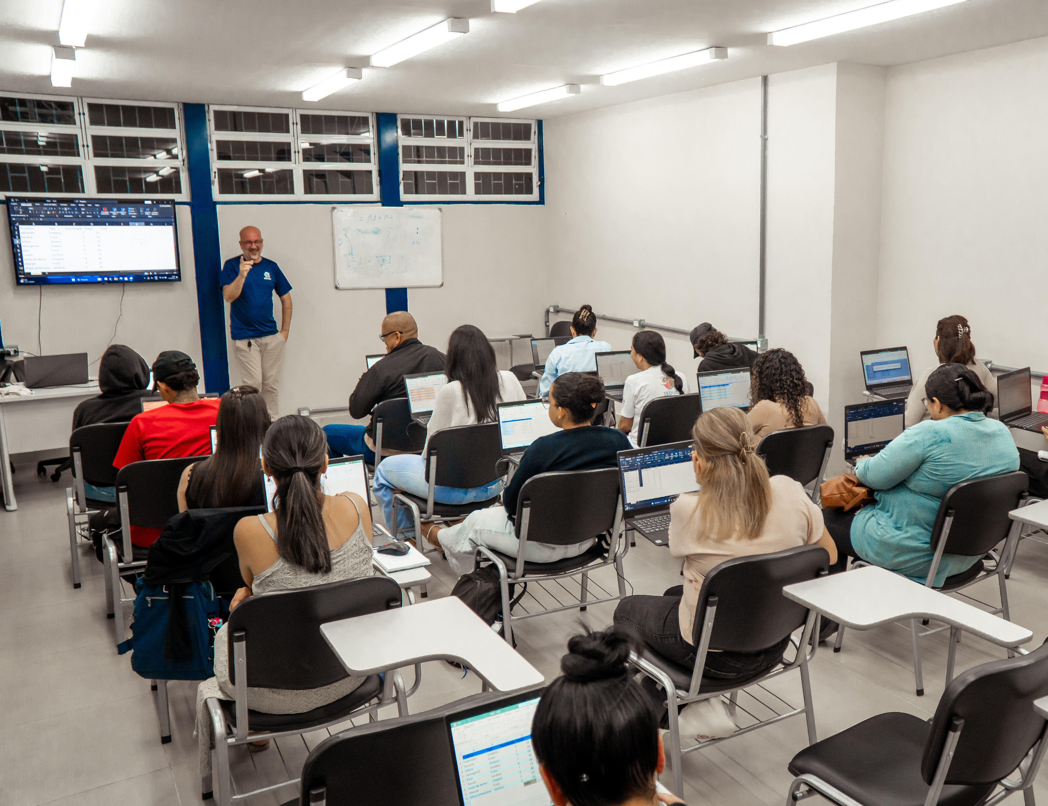 #PraTodosVerem: As imagens mostram uma sala de aula de cursos anteriores realizados no CIP. Em uma delas, os alunos estão sentados em suas carteiras, com notebooks abertos, acompanhando a aula ministrada pelo professor. Na outra, a turma aparece atenta enquanto quatro palestrantes estão à frente da sala, conduzindo um diálogo com os participantes. Fim da descrição.