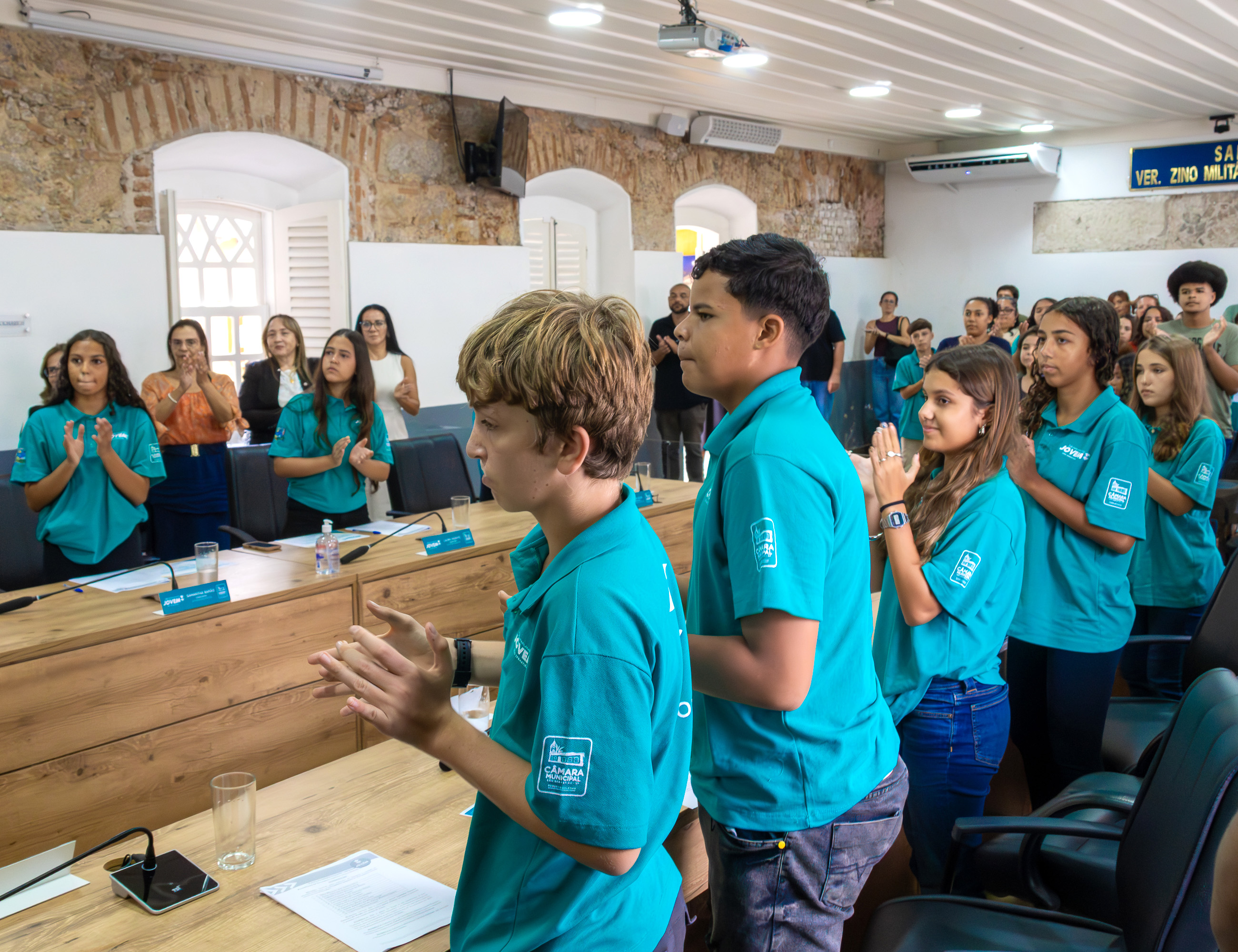 #PraTodosVerem: As imagens mostram um grupo de adolescentes vestindo uniformes polo na cor azul-turquesa com o logotipo do evento, engajados em atividades legislativas dentro de um plenário com paredes de pedra rústica e móveis de madeira clara. Na primeira foto, os jovens aparecem de pé aplaudindo em um ambiente movimentado; na segunda, uma jovem de blusa vermelha discursa em uma tribuna enquanto outros colegas compõem a mesa de trabalhos; e a terceira imagem é um retrato oficial do grupo reunido em frente a um monitor que exibe o anúncio da sessão solene, acompanhados por alguns adultos. O clima é de formalidade e protagonismo juvenil, com a presença de bandeiras oficiais e placas de identificação sobre as bancadas. Fim da descrição.
