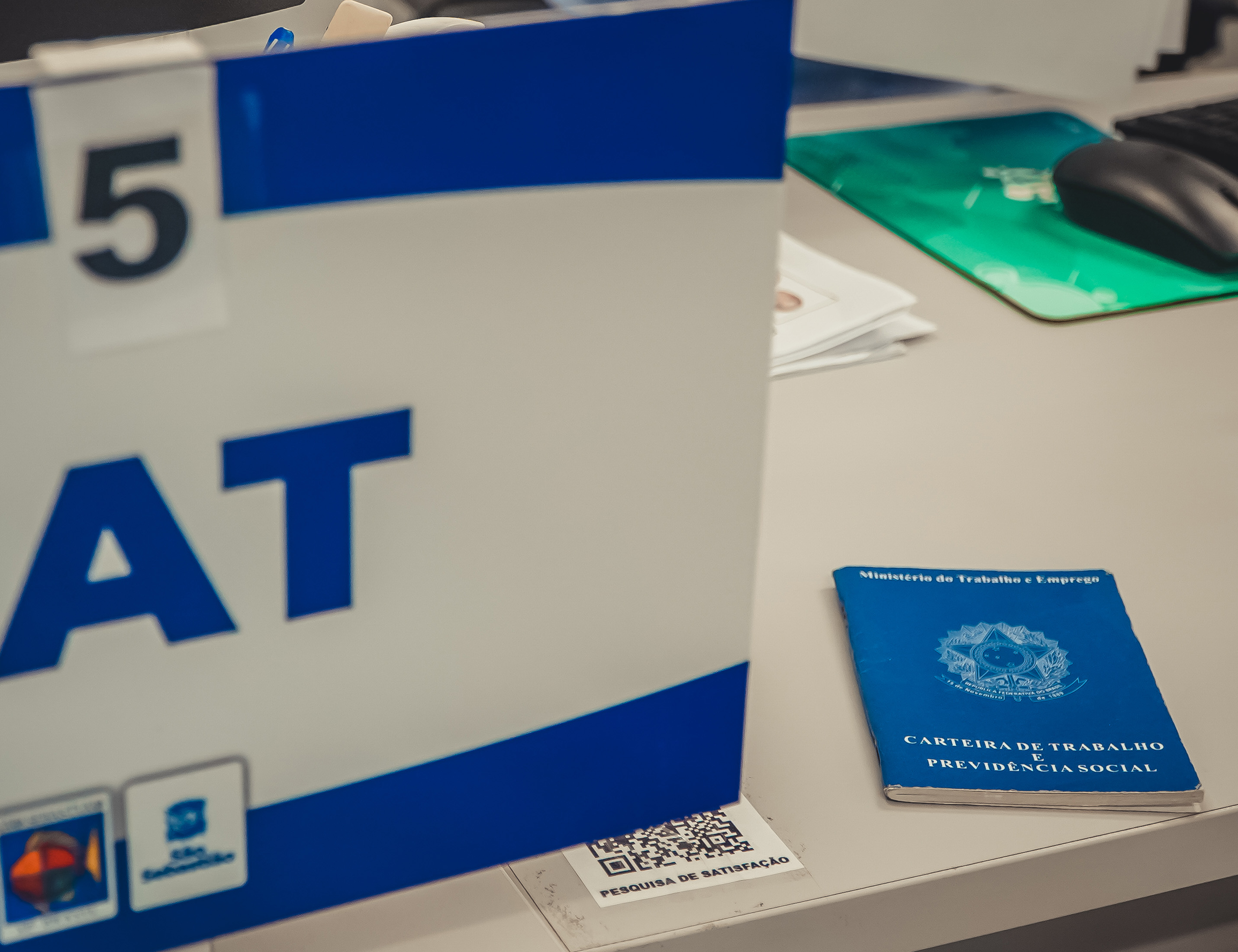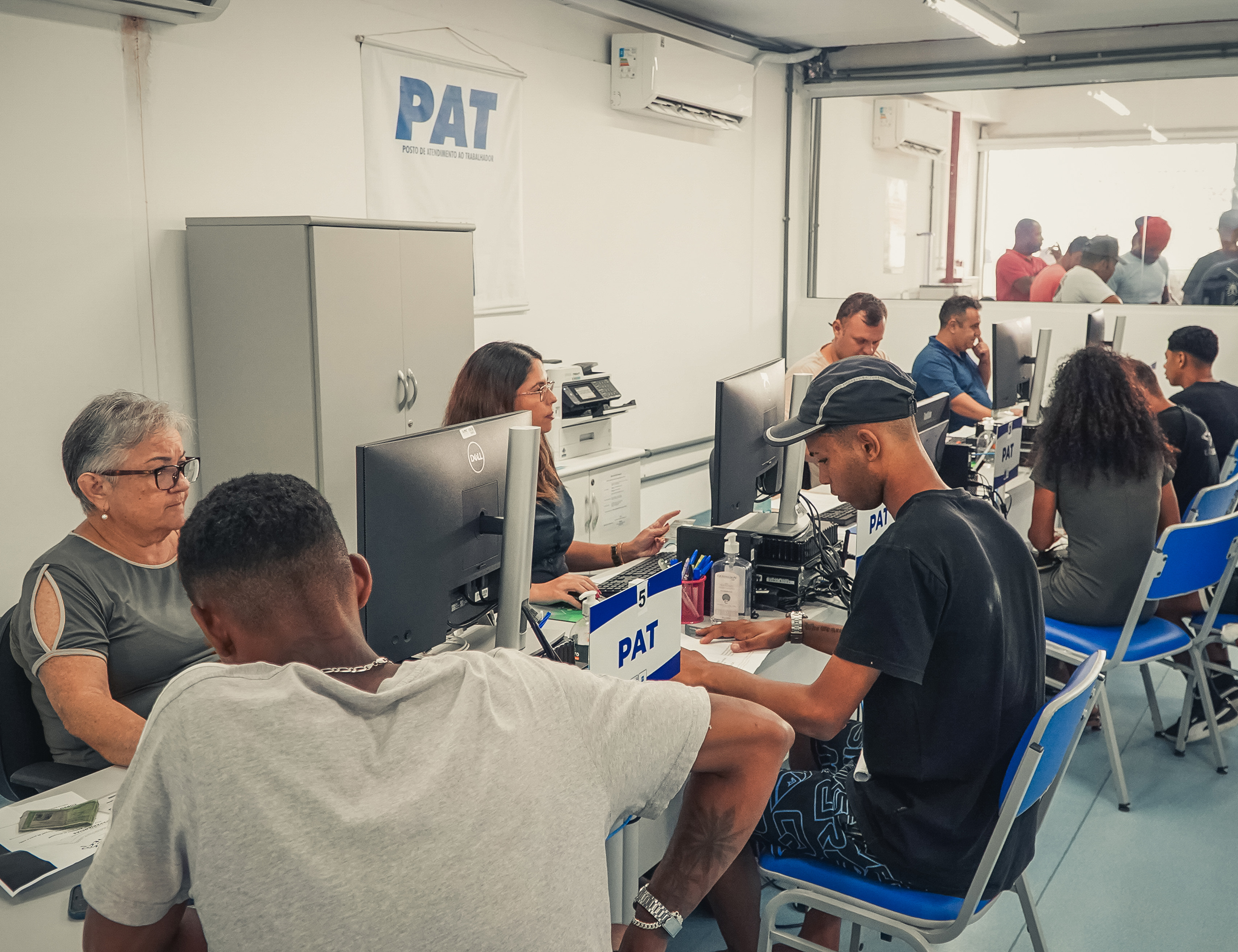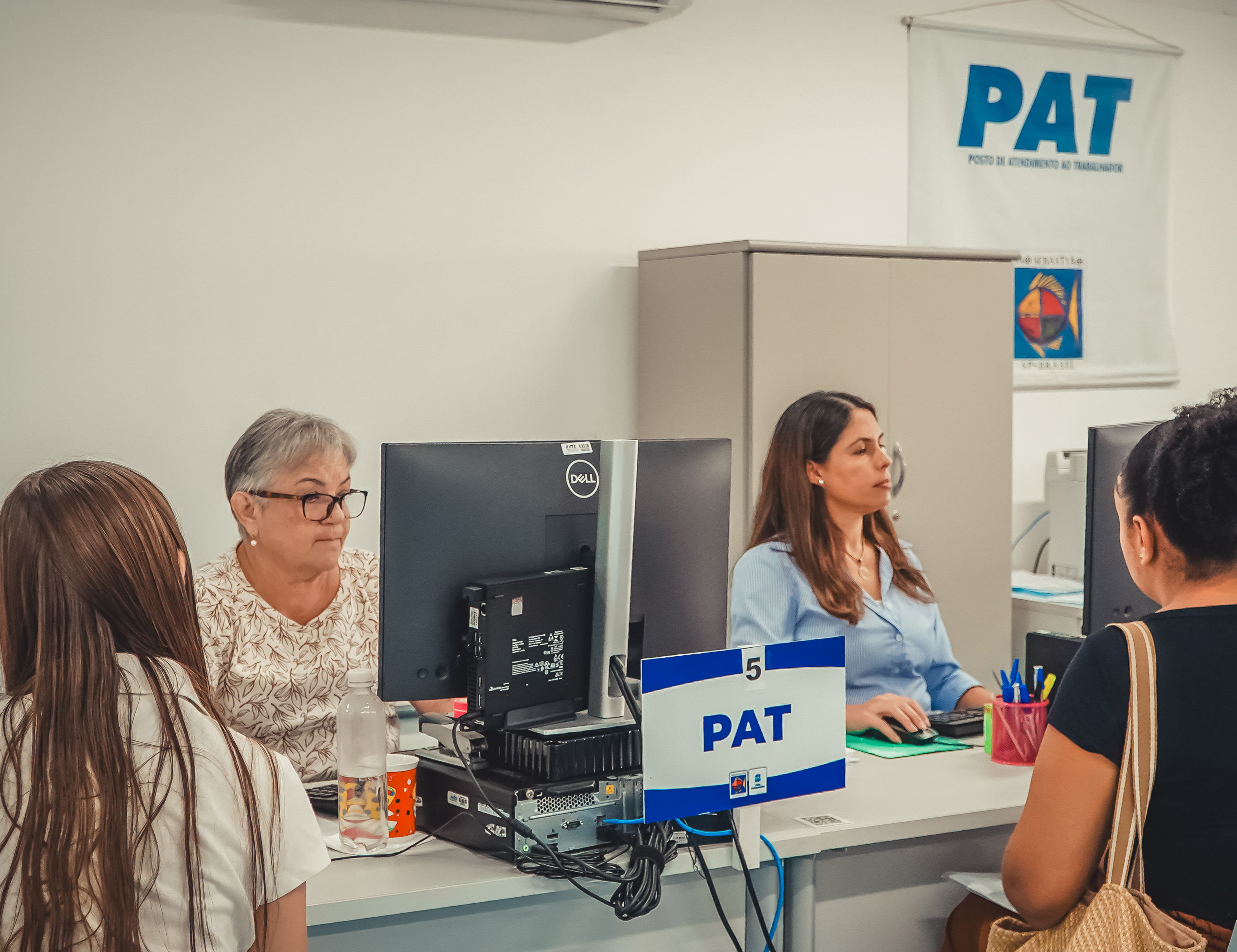 #PraTodosVerem: Em duas das imagens, candidatos realizam cadastro e recebem orientações de funcionárias do PAT em atendimentos individuais, em ambiente interno com estações de atendimento. Em outra imagem, o foco está em uma mesa de atendimento, destacando a placa de identificação do guichê com a inscrição PAT e, ao fundo, uma Carteira de Trabalho sobre a superfície. Fim da descrição.