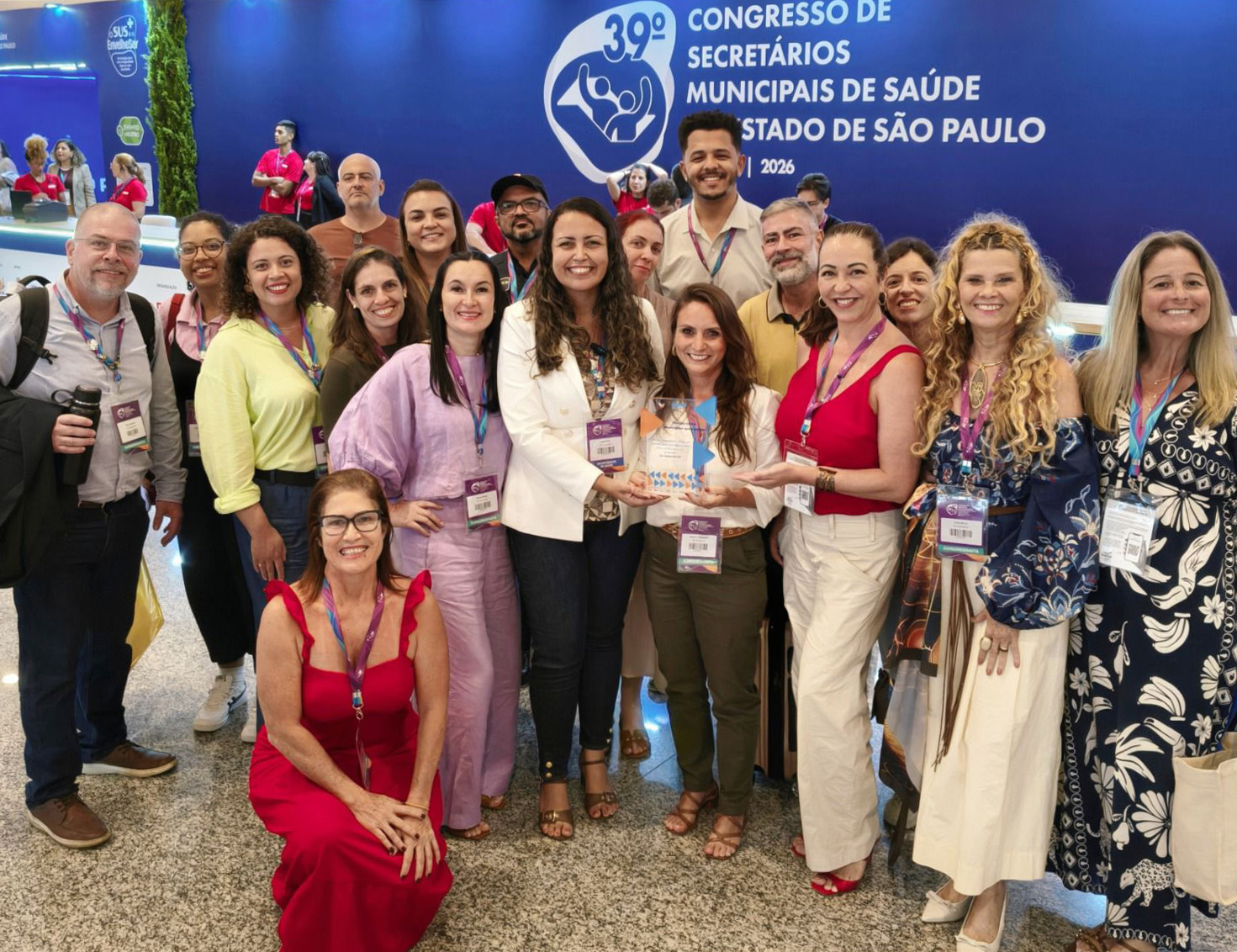 #PraTodosVerem: Conjunto de quatro fotografias registra a comitiva de São Sebastião no 39º Congresso de Secretários Municipais de Saúde em Santos, abril de 2026. As imagens mostram o grupo reunido em frente a painéis do evento e celebrando no palco a conquista do prêmio na "22ª Mostra de Experiências Exitosas". Em destaque, representantes seguram um troféu de acrílico transparente com detalhes em azul e laranja, celebrando o reconhecimento de práticas integrativas de saúde em um ambiente de alegria e integração profissional. Fim da descrição.
