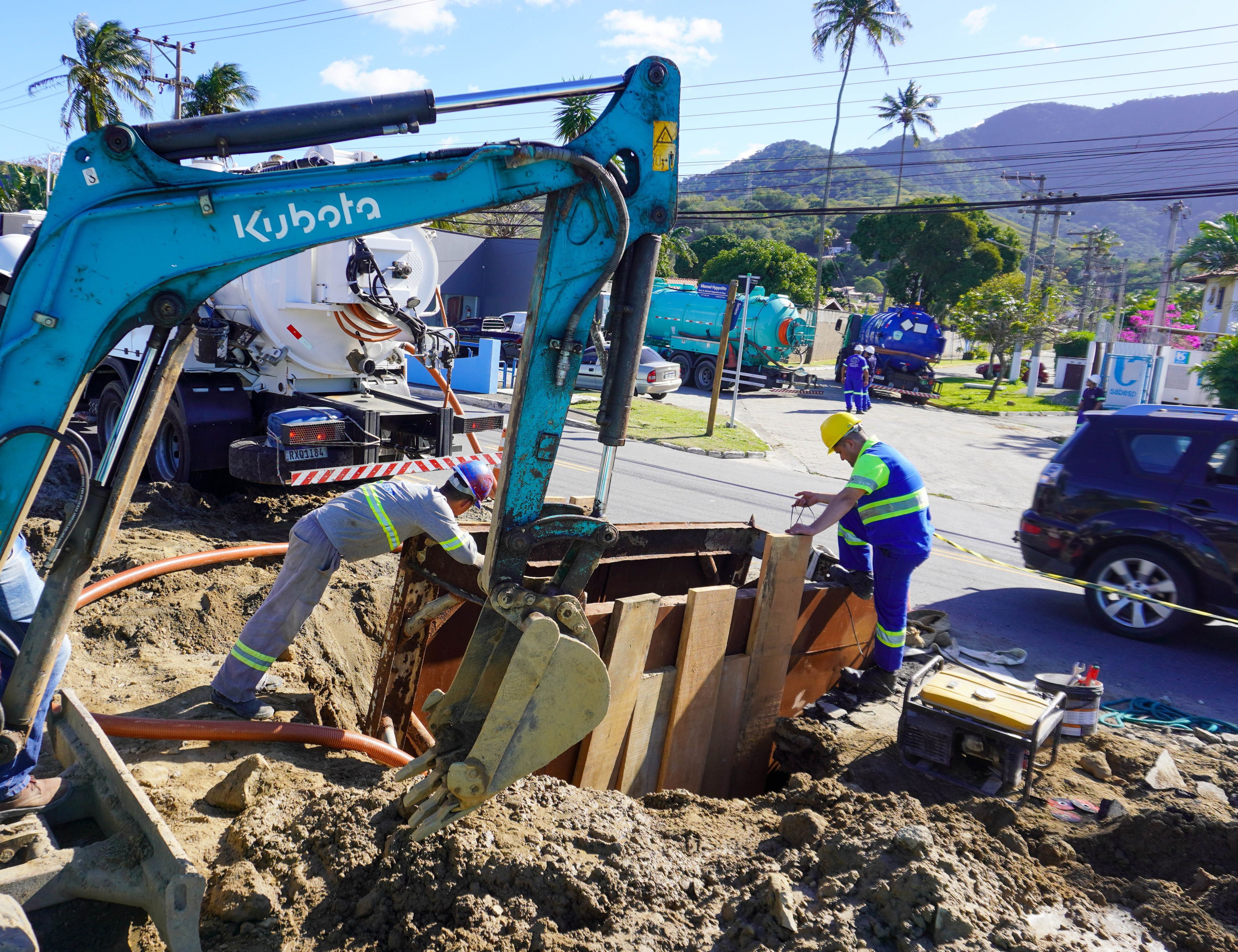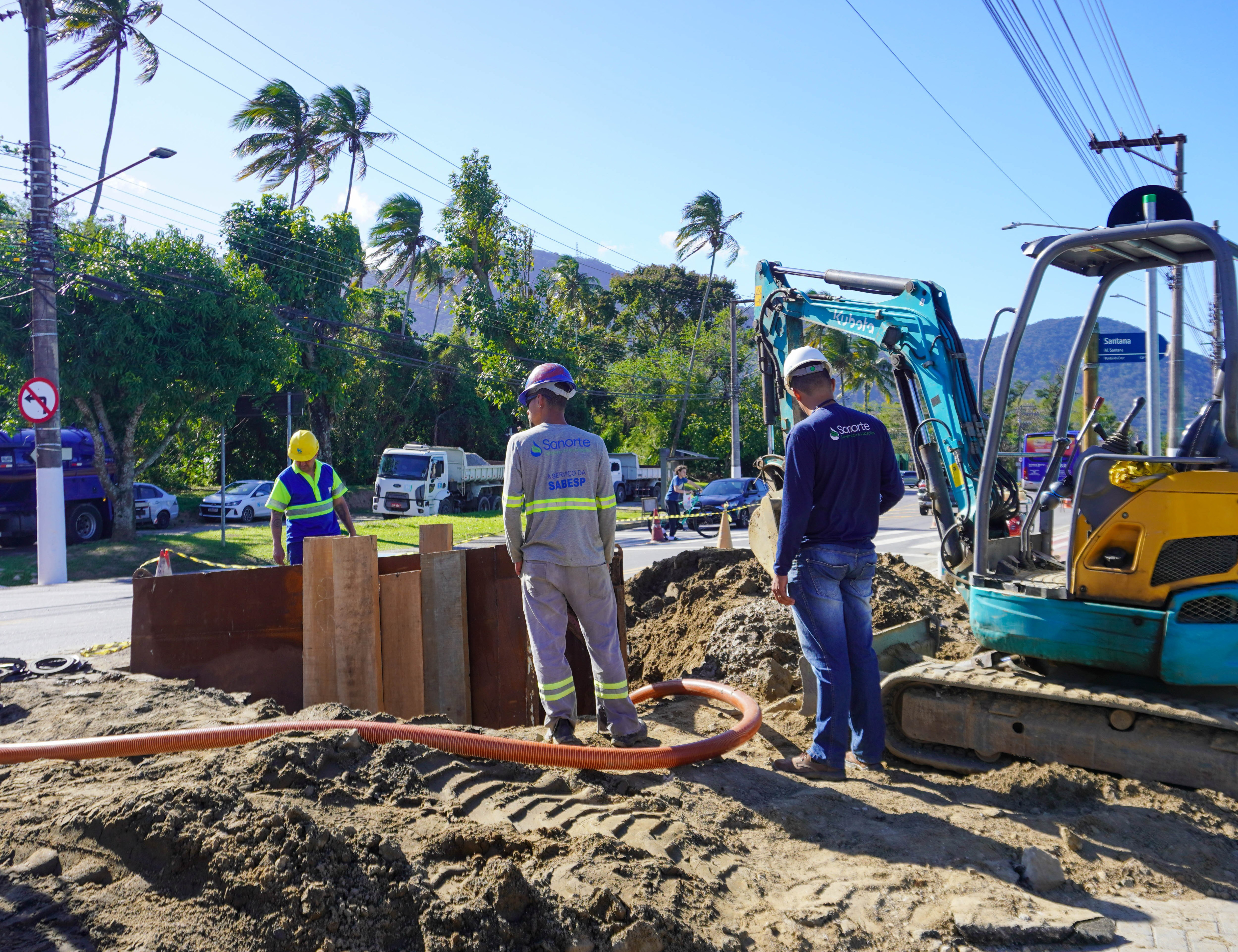 Na área de abastecimento, o sistema Sahy-Baleia atende bairros como Baleia Verde, Baleia, Sahy, Vila Sahy, Camburi, Camburizinho e Sertão do Camburi, com conclusão prevista para 2026. Já o sistema de coleta de esgoto em Baleia Verde, Vila Sahy e Maria Caetana apresenta 70% das redes executadas e 40% das ligações concluídas, com duas elevatórias e um booster instalados. No núcleo Beira Rio, as obras de distribuição de água e coleta de esgoto avançam por etapas, com 40% das redes e 10% das ligações executadas, além de três elevatórias e três boosters implantados, com previsão de término em 2027.