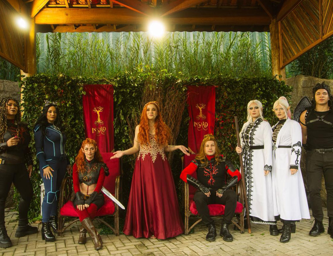 #PraTodosVerem: Imagens de evento temático de fantasia medieval. Grupo de pessoas caracterizadas posa em frente a cenário com bandeiras vermelhas; ao centro, mulher com vestido longo vermelho, com público ao redor e decoração em vermelho e preto. Capa de livro de fantasia, com personagem destacada. Fim da descrição