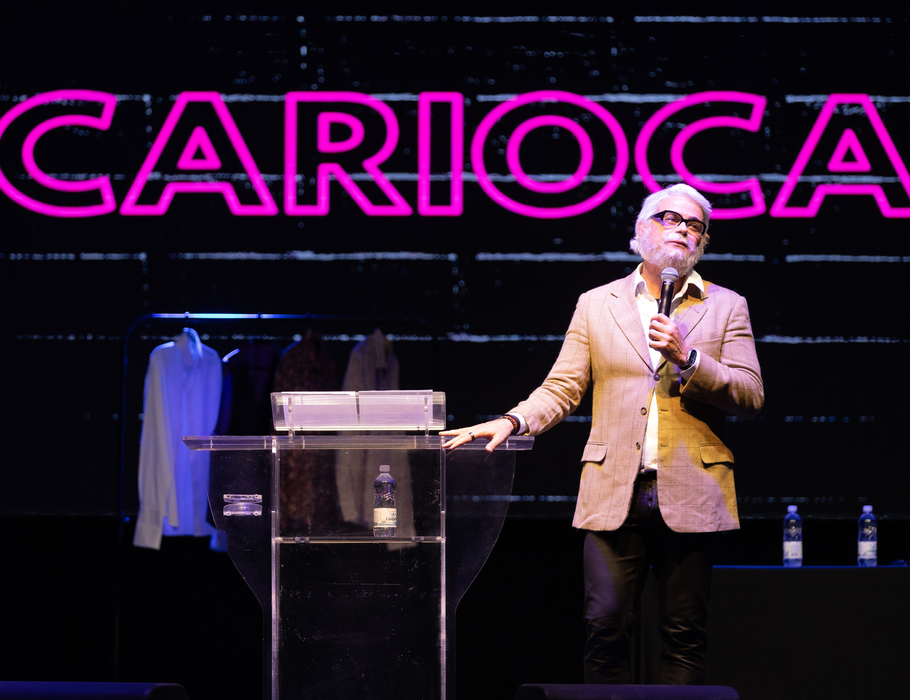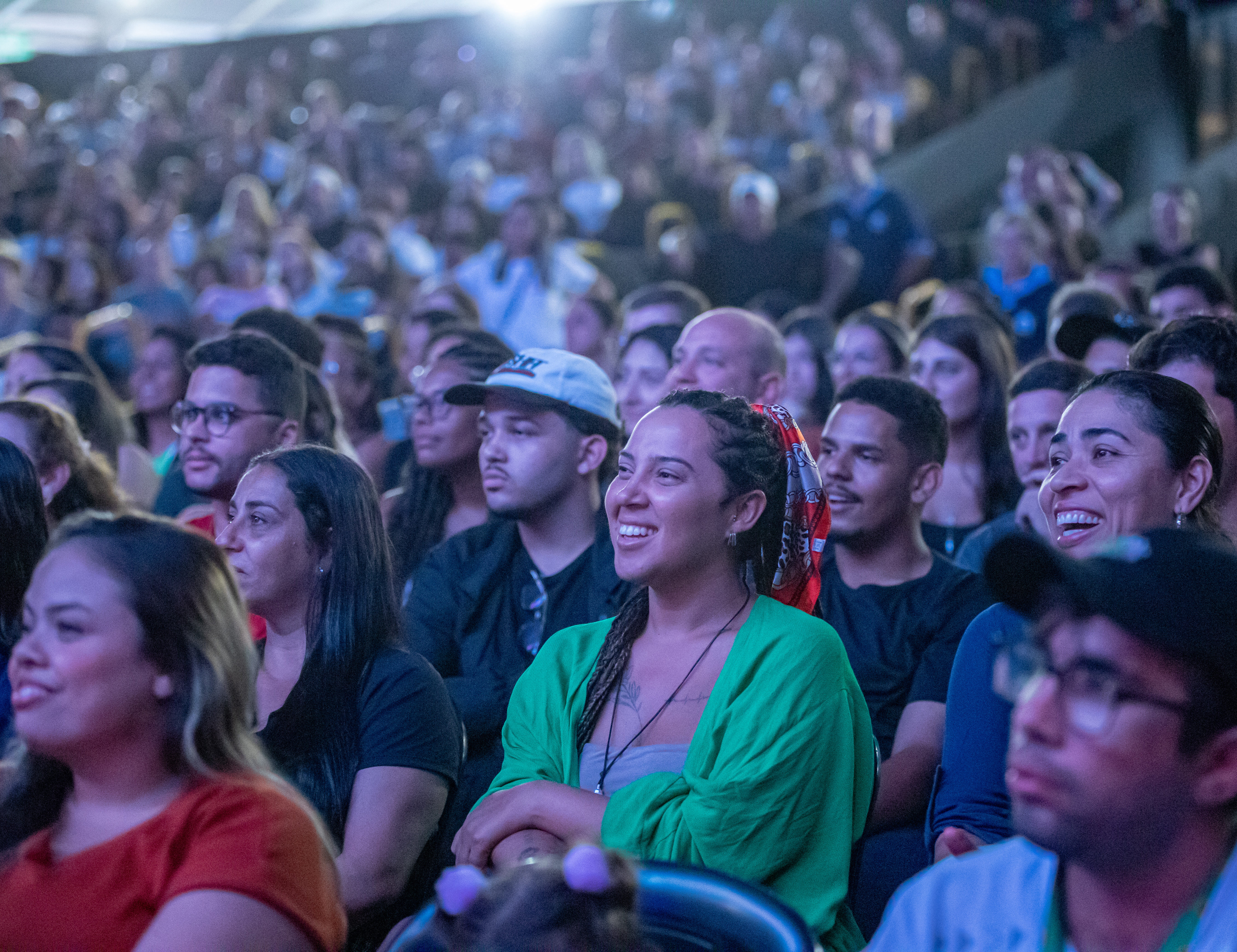 #PraTodosVerem: Imagens do Festival HAHAHA em São Sebastião mostram apresentações de comédia em palco com iluminação cênica, artistas com microfone e grande presença de público. A plateia aparece atenta, em um ambiente amplo e estruturado. Fim da descrição