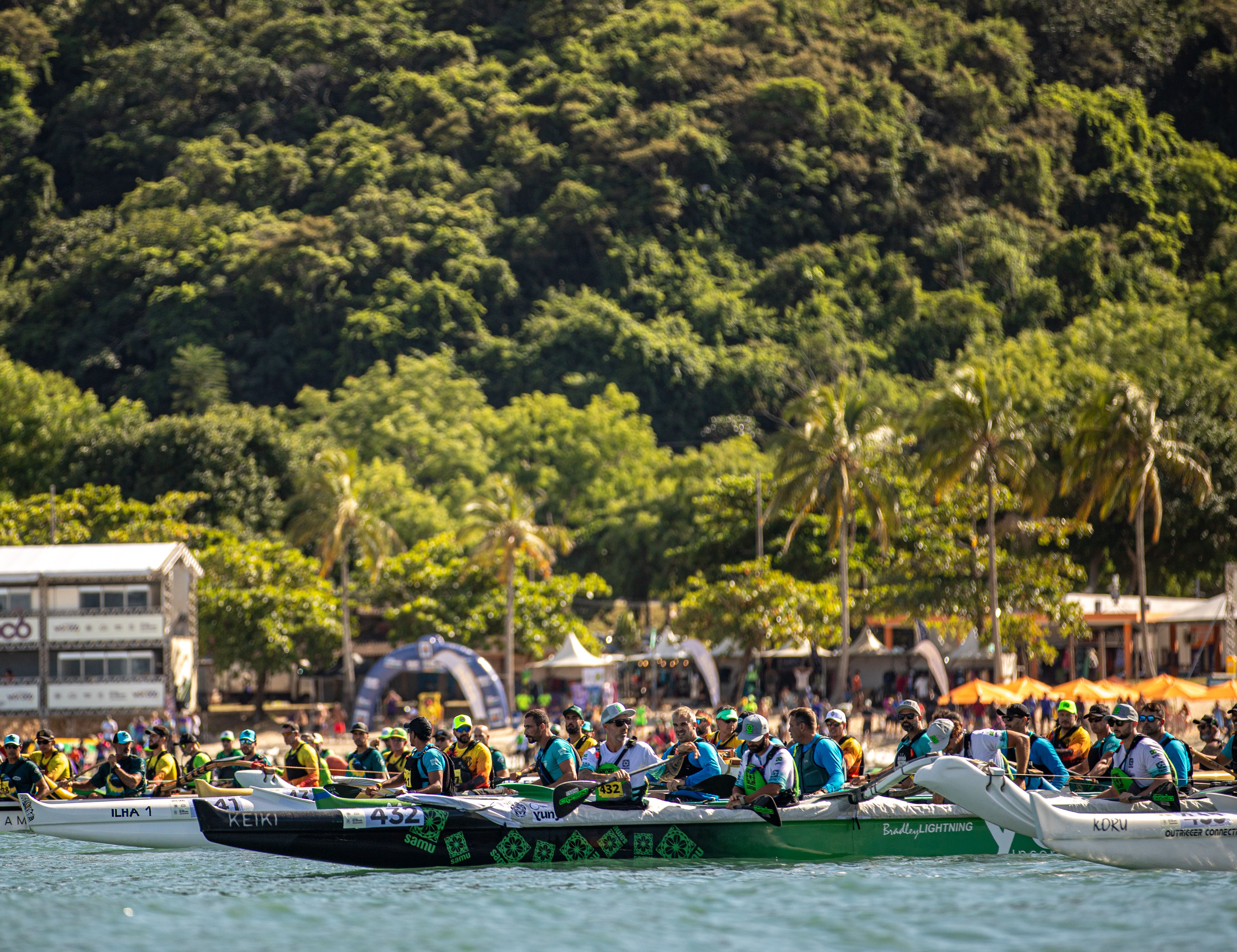 #PraTodosVerem: As imagens mostram o movimento de pessoas nas praias durante o evento. Homens, mulheres e crianças, vestidos com roupas de banho, andam na areia da praia ensolarada, em meio a canoas havaianas, e observam atletas remando e nadando no mar azul. Fim da descrição.