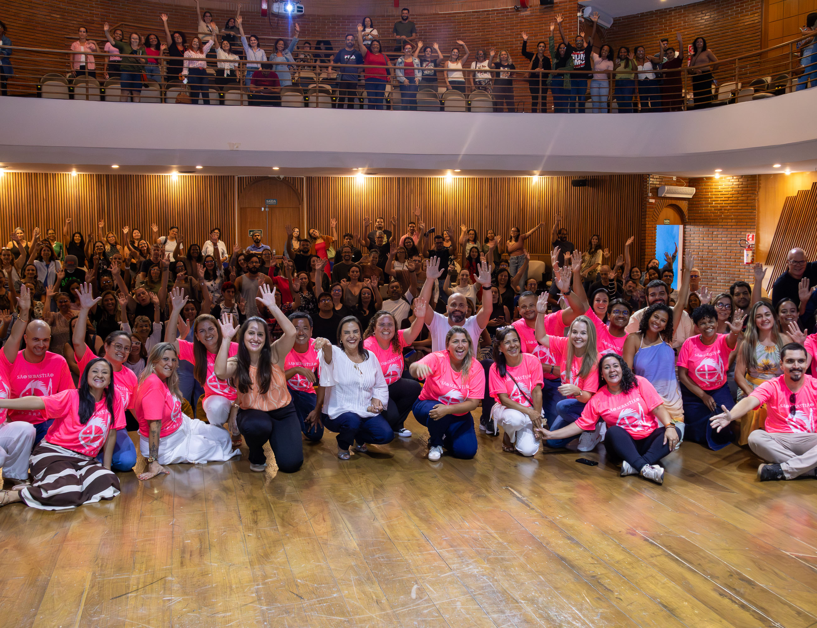 #PraTodosVerem: Este conjunto de quatro fotografias registra um evento educacional realizado em um auditório amplo, com paredes de tijolos à vista e iluminação quente. As três primeiras imagens mostram a perspectiva da plateia em direção ao palco, onde palestrantes apresentam slides sobre projetos pedagógicos, como o ‘Projeto Regeneração’ e o ensino da matemática através de jogos, com a presença de bandeiras oficiais e um banner da Secretaria da Educação (Seduc). A última foto captura um momento de celebração coletiva, reunindo dezenas de participantes no palco e nos balcões superiores; muitos vestem camisetas rosa vibrante e todos acenam alegremente para a câmera, transmitindo um clima de integração e encerramento de atividades. Fim da descrição.