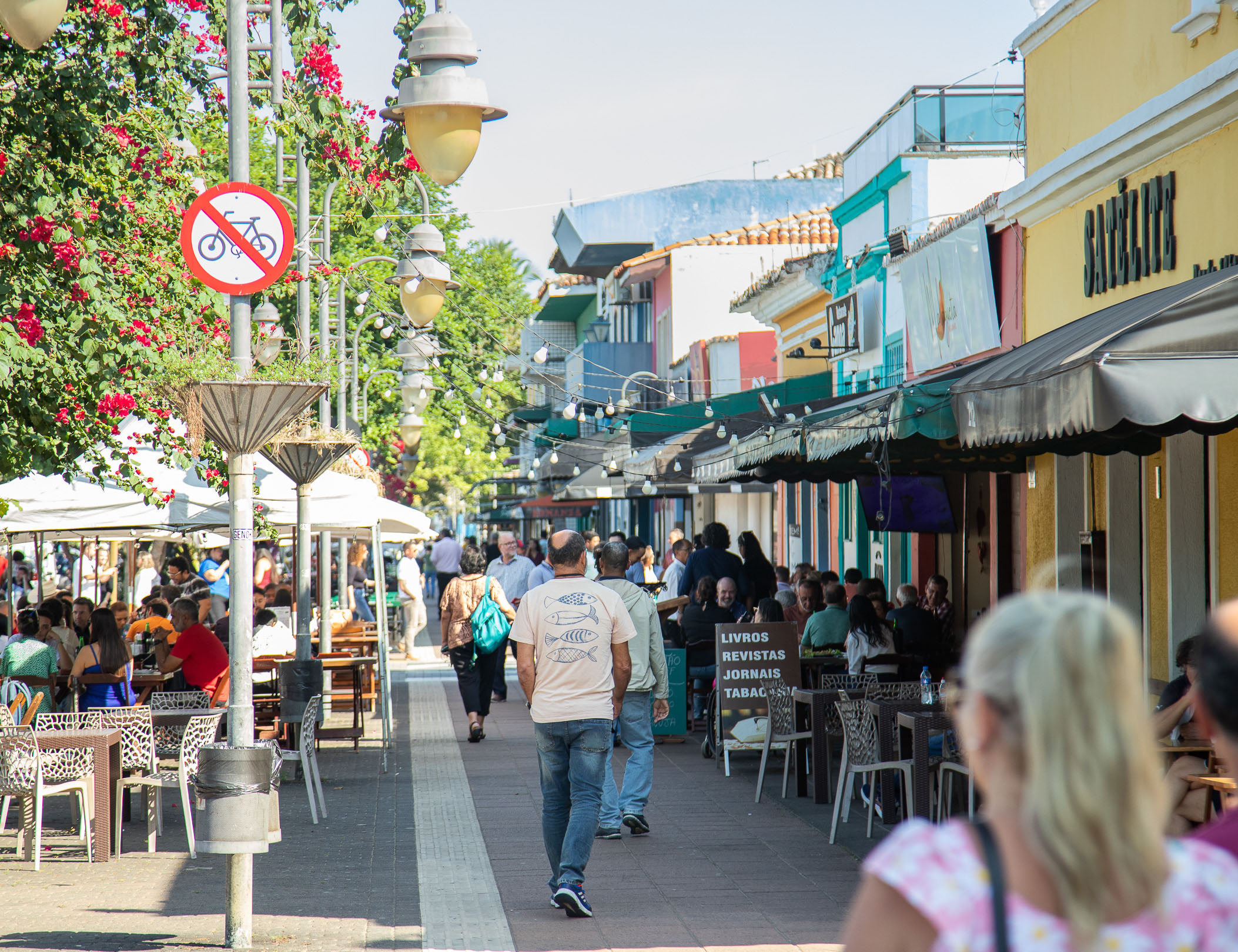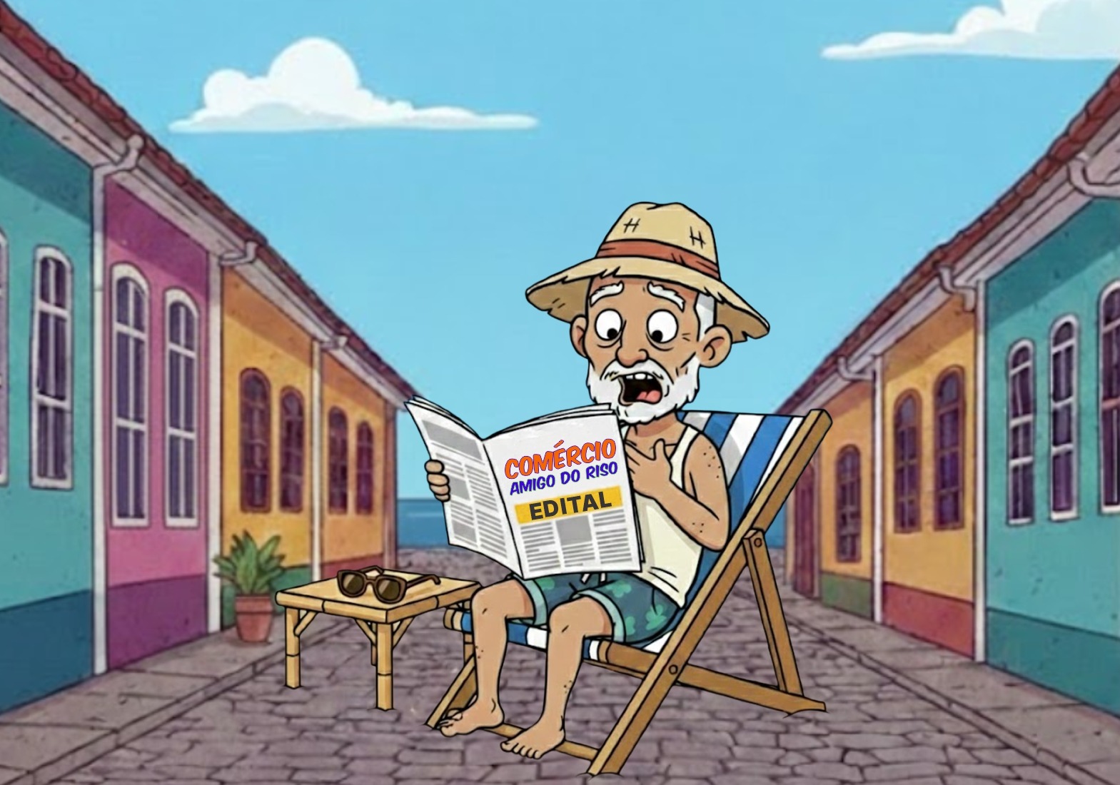 #PraTodosVerem: Arte de um senhor caiçara lendo jornal em uma rua colorida e, em outra imagem, Rua da Praia movimentada com bares, mesas ao ar livre e pessoas caminhando. Fim da descrição.