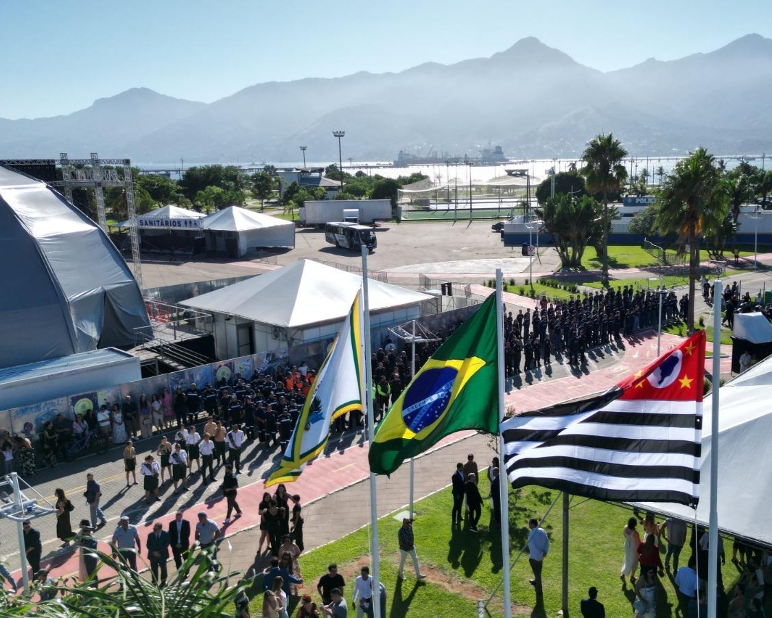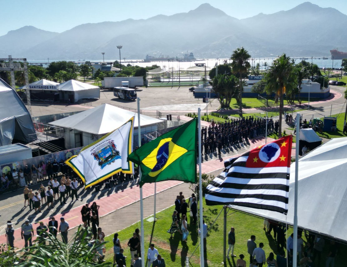 #PraTodosVerem: Sequência de registros da celebração de 390 anos de São Sebastião, iniciada por vistas aéreas da Praça de Eventos com as bandeiras de São Sebastião, do Brasil e do Estado de São Paulo hasteadas em destaque sob o céu claro. Ao fundo, veem-se as montanhas da Serra do Mar e o canal do porto. As imagens mostram autoridades civis e militares reunidas em um palco sob tenda branca, além de desfiles de grupamentos da Guarda Civil Municipal e da Marinha em formação pelas vias da praça, acompanhados por munícipes em um clima solene e ensolarado. Fim da descrição.